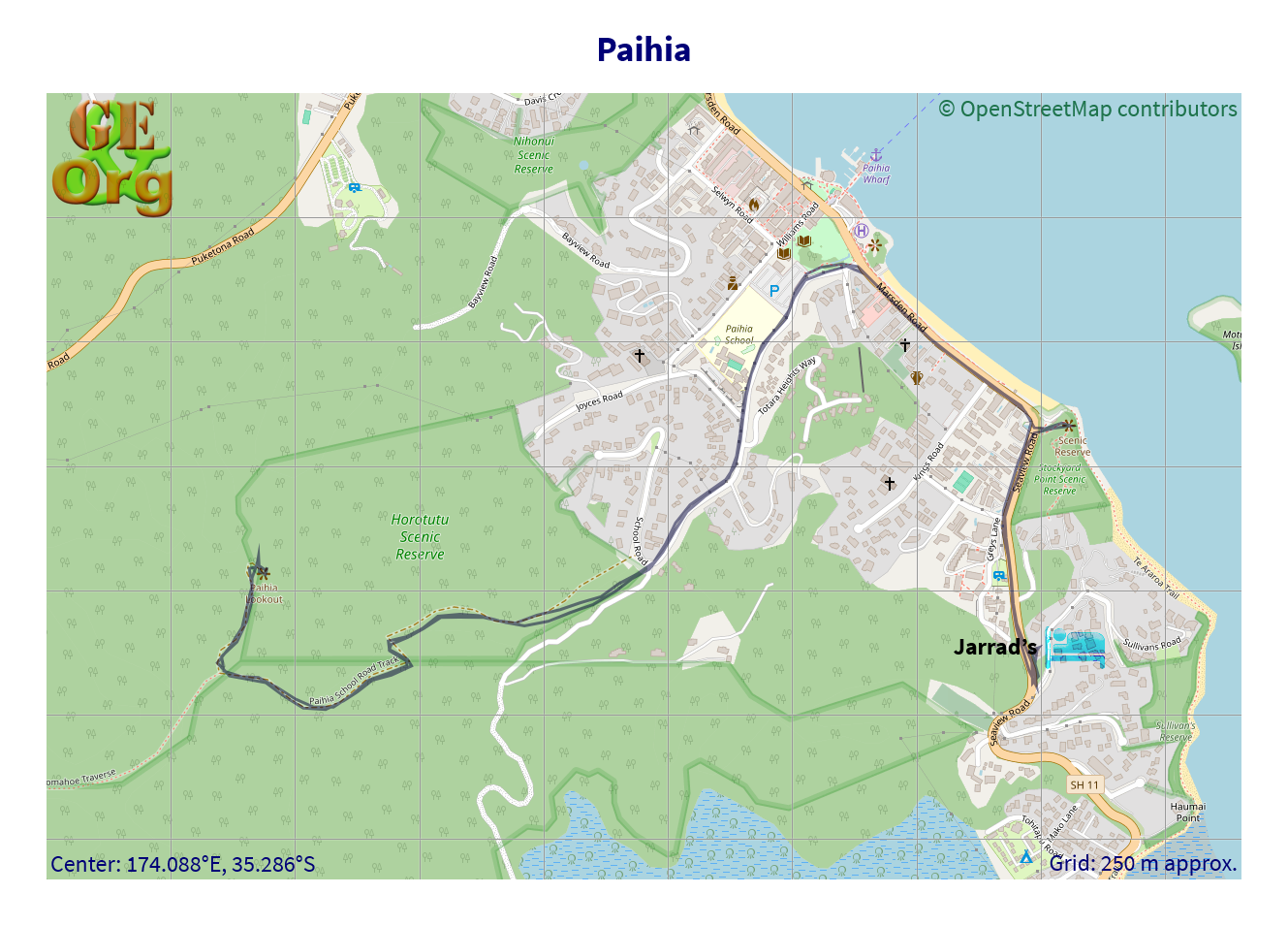 Paihia, one GPX file, one GeoJSON file, one OpenStreetMap.