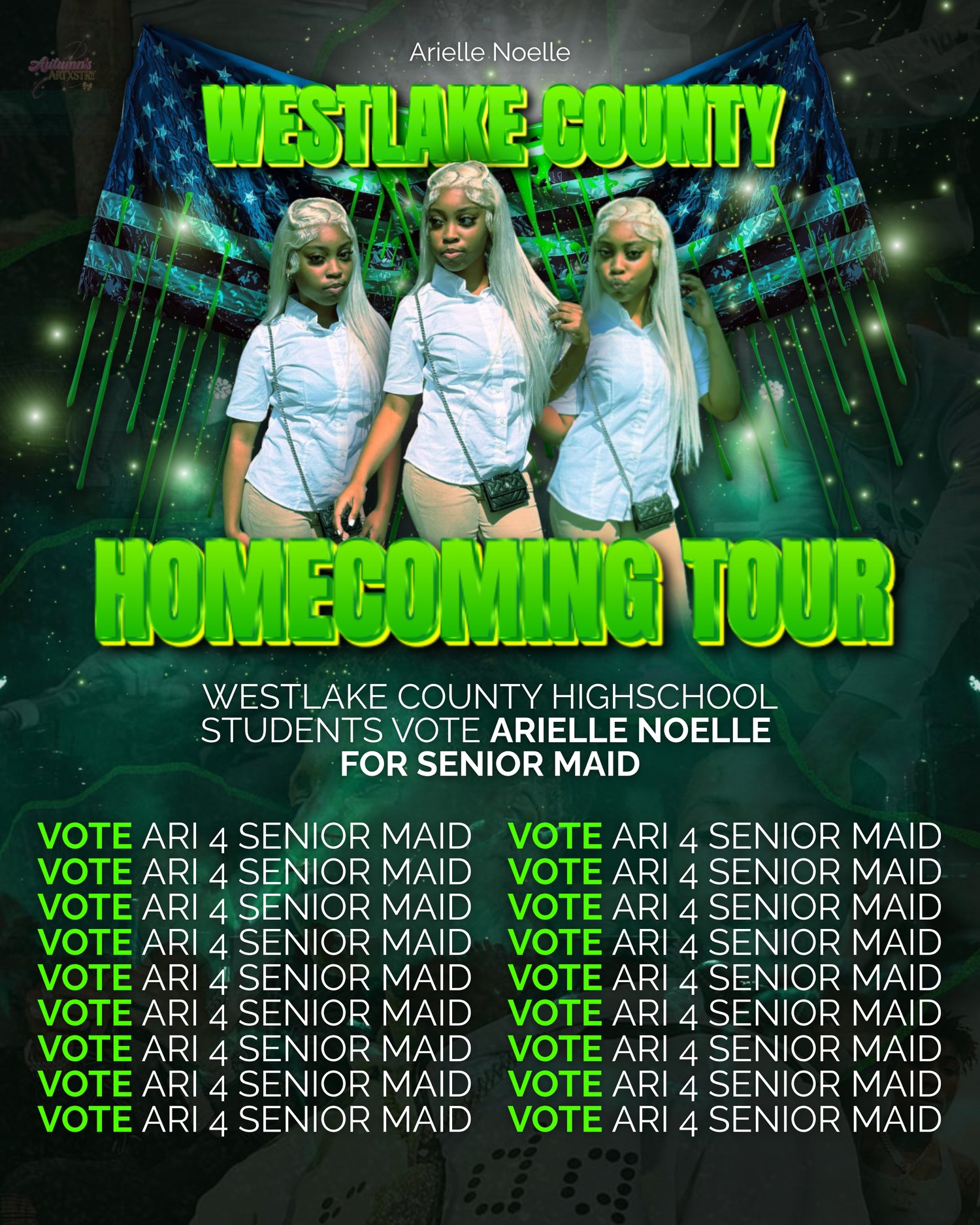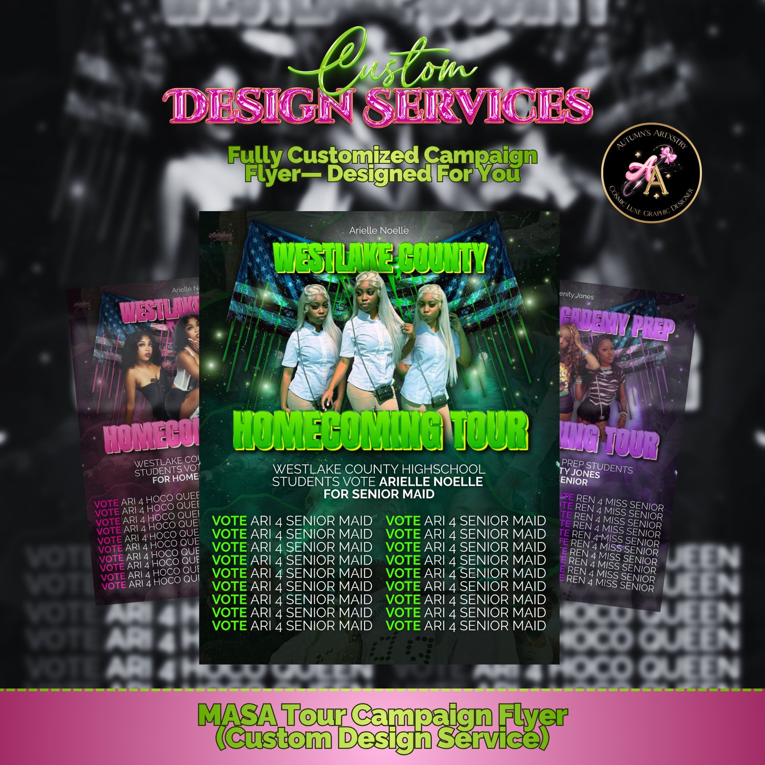 This MASA Tour–inspired flyer is designed to grab attention, build hype, and make your name stand out. Perfect for homecoming court, school elections, and student campaigns that need a bold, high-energy look.