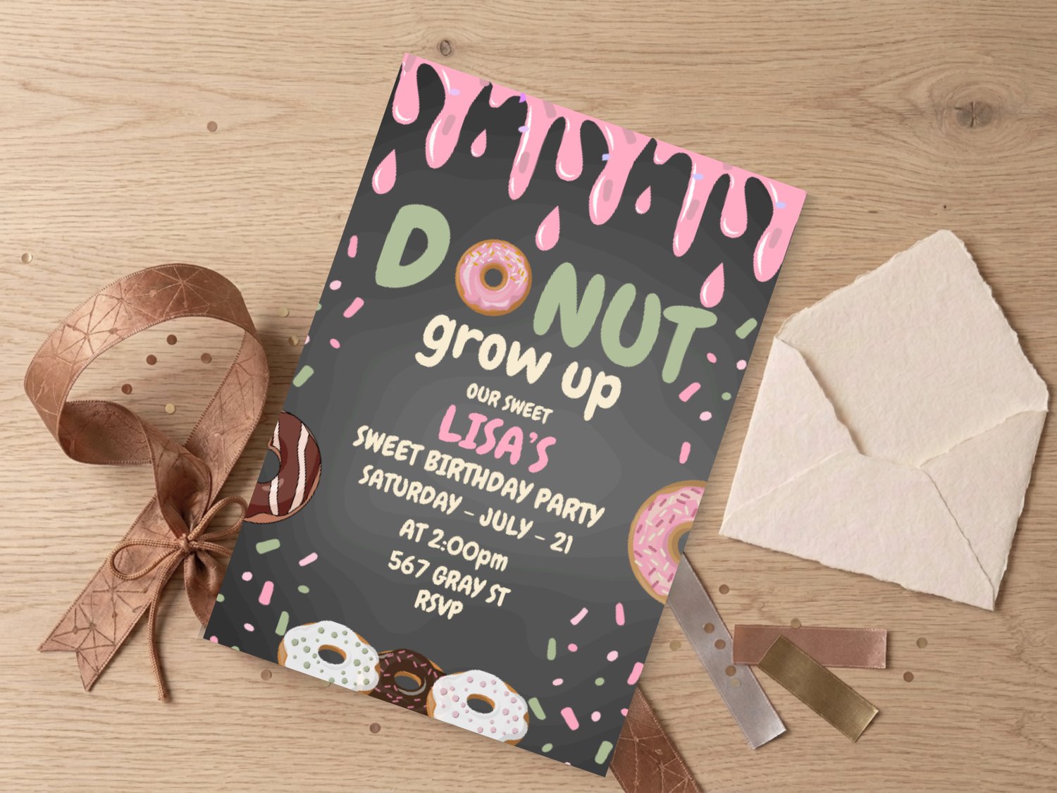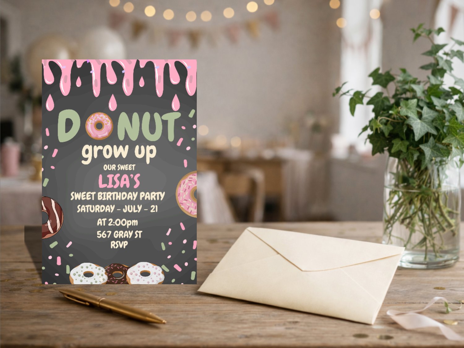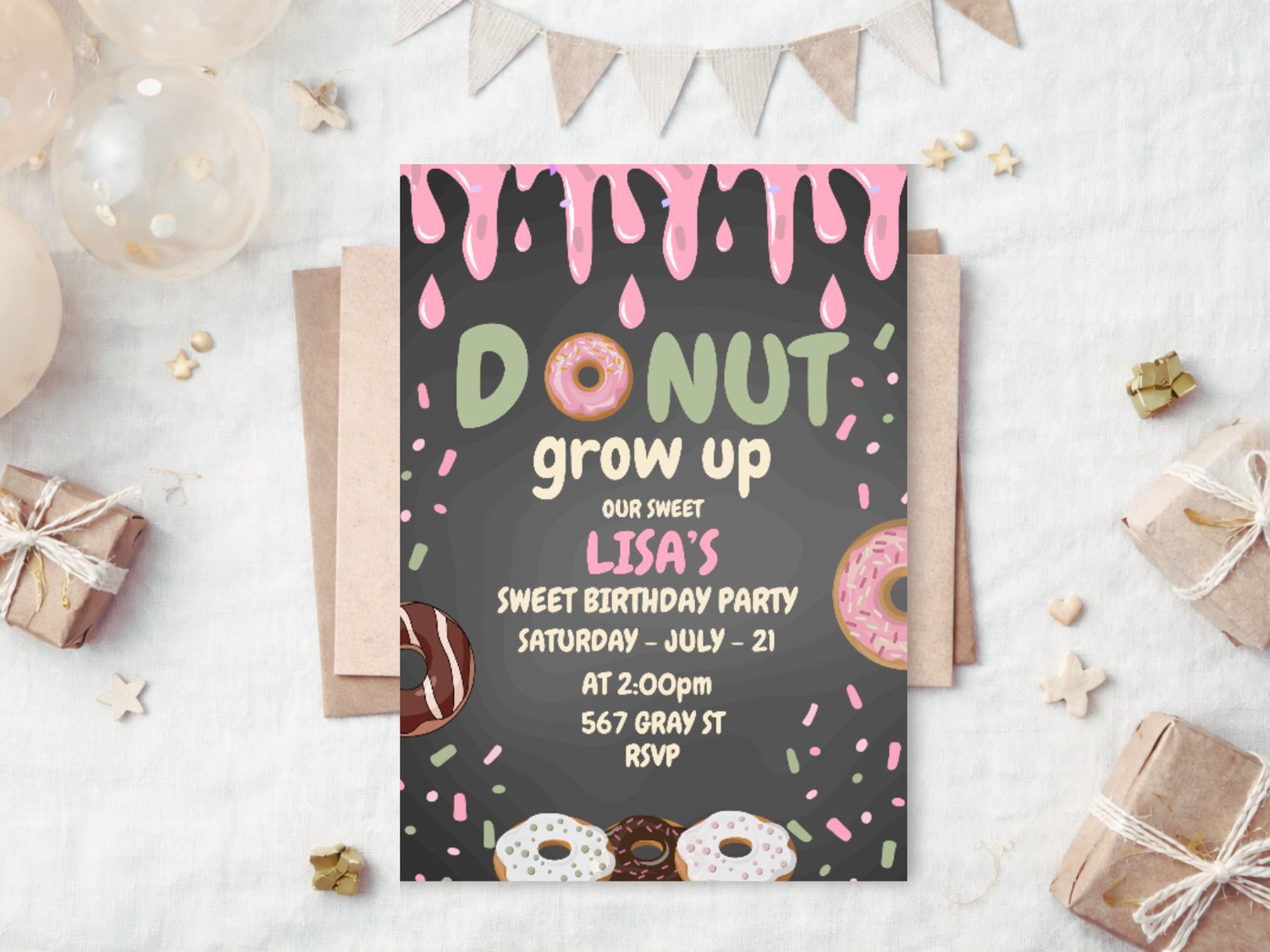 Tired of generic birthday invites or scrambling at the last minute? This Donut Grow Up Birthday Invitation makes party planning simple and fun! Featuring soft pastel colors and playful donut designs, this editable 5x7 Canva template lets you customize all your party details in minutes. Download instantly and print at home or send digitally β your search ends here, this invite has everything you need.