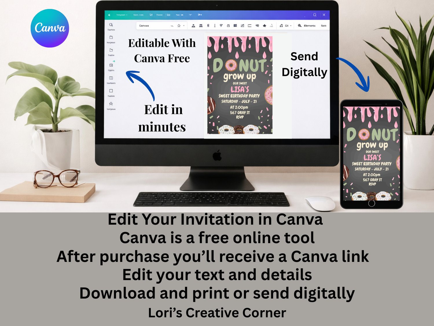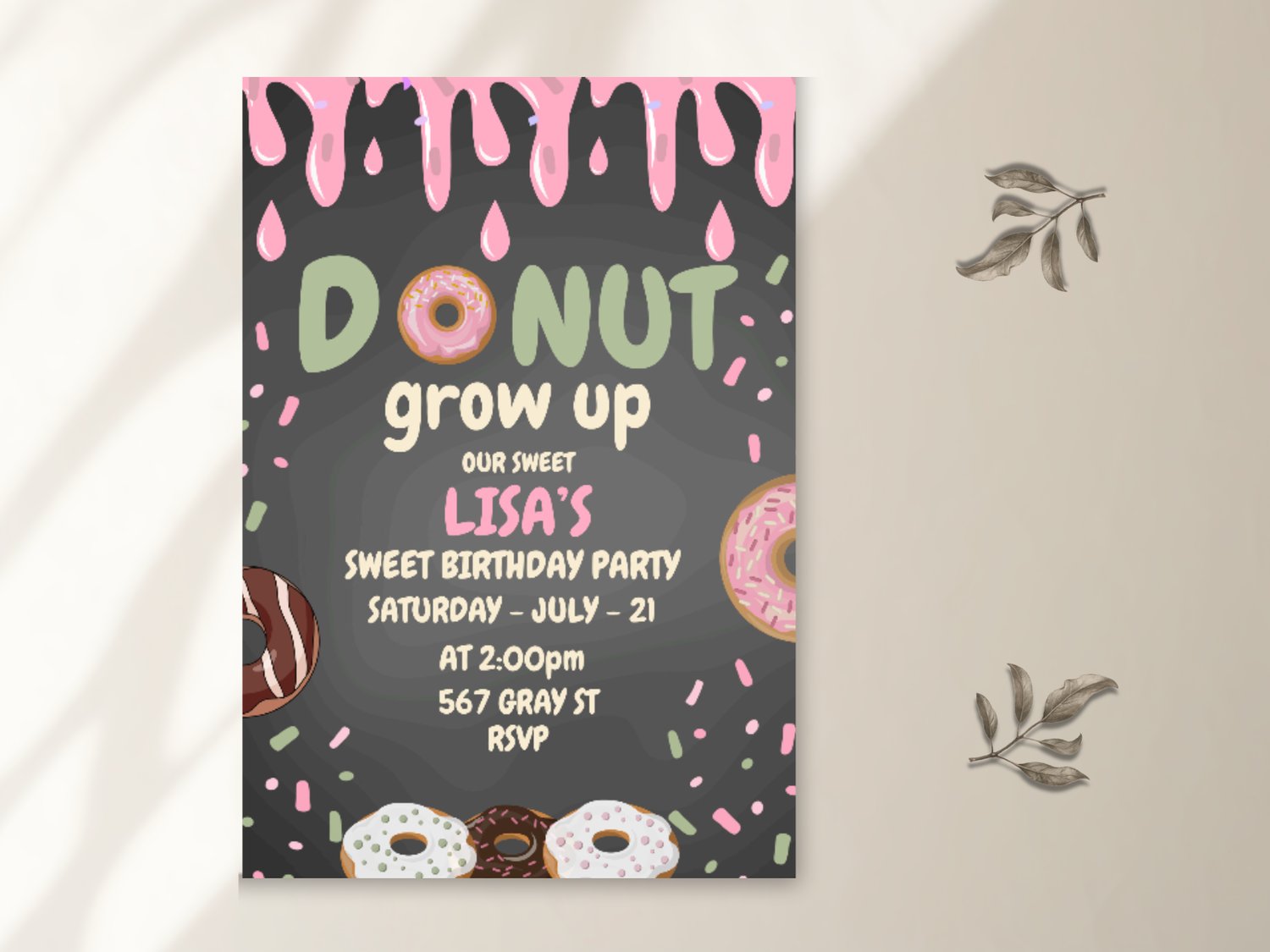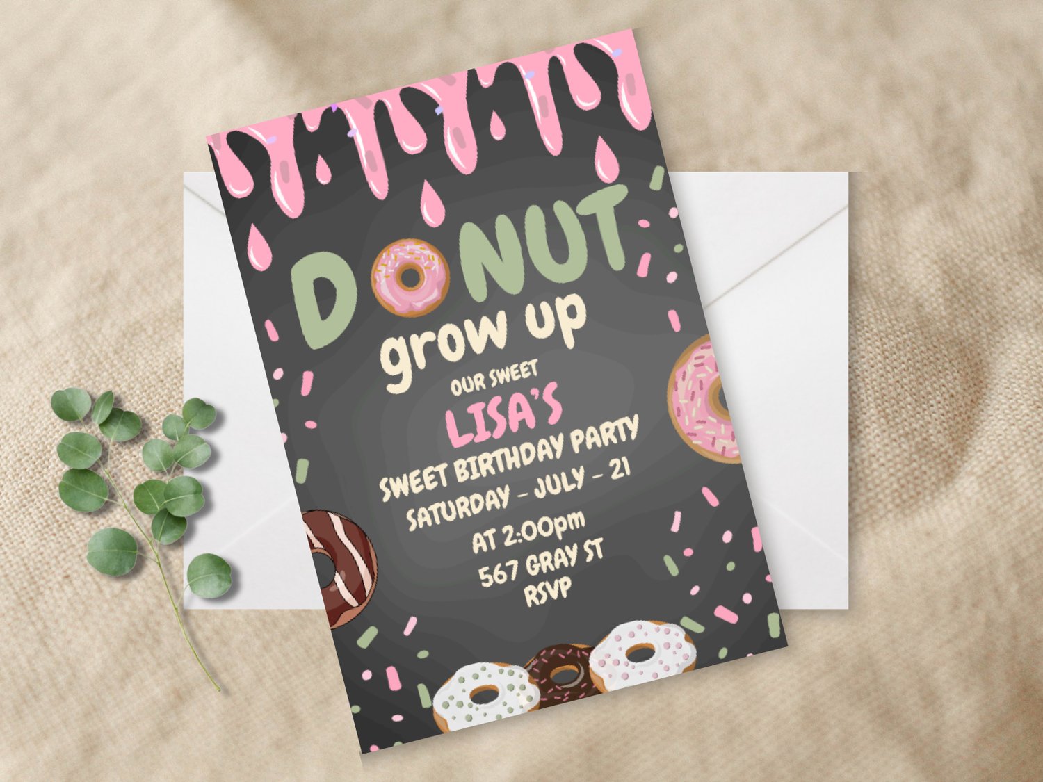Tired of generic birthday invites or scrambling at the last minute? This Donut Grow Up Birthday Invitation makes party planning simple and fun! Featuring soft pastel colors and playful donut designs, this editable 5x7 Canva template lets you customize all your party details in minutes. Download instantly and print at home or send digitally β your search ends here, this invite has everything you need.