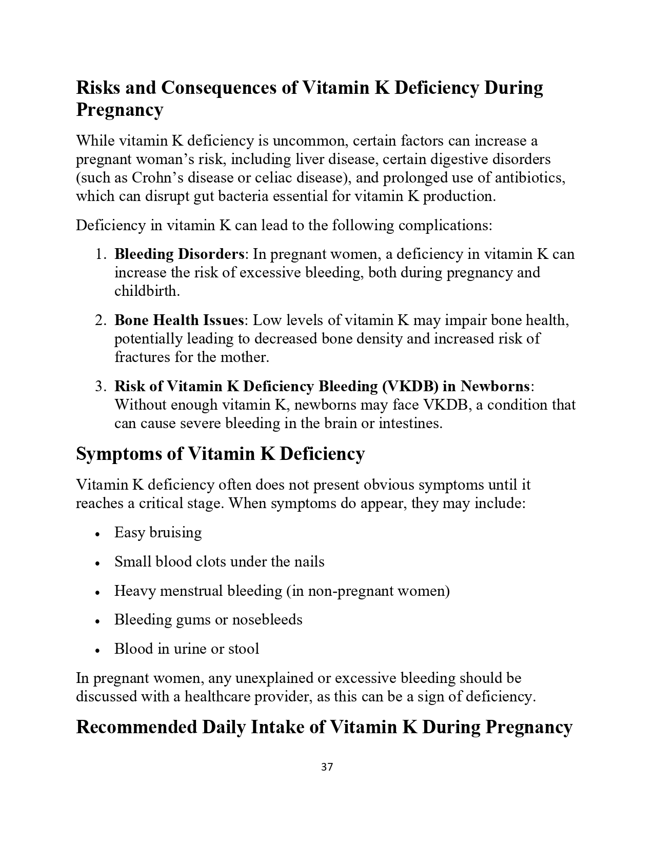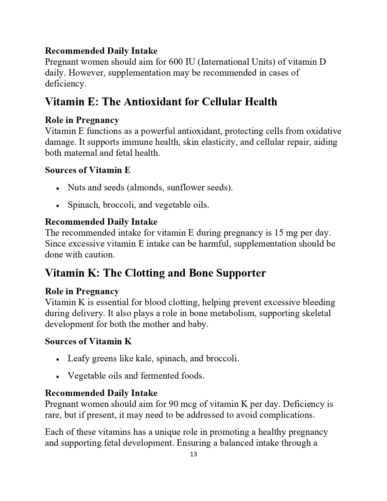 - In-Depth Knowledge: Explore the importance of essential vitamins during pregnancy, including A, B Complex, C, D, E, and K. Understand their roles, risks of deficiencies, and how to incorporate them into your diet.