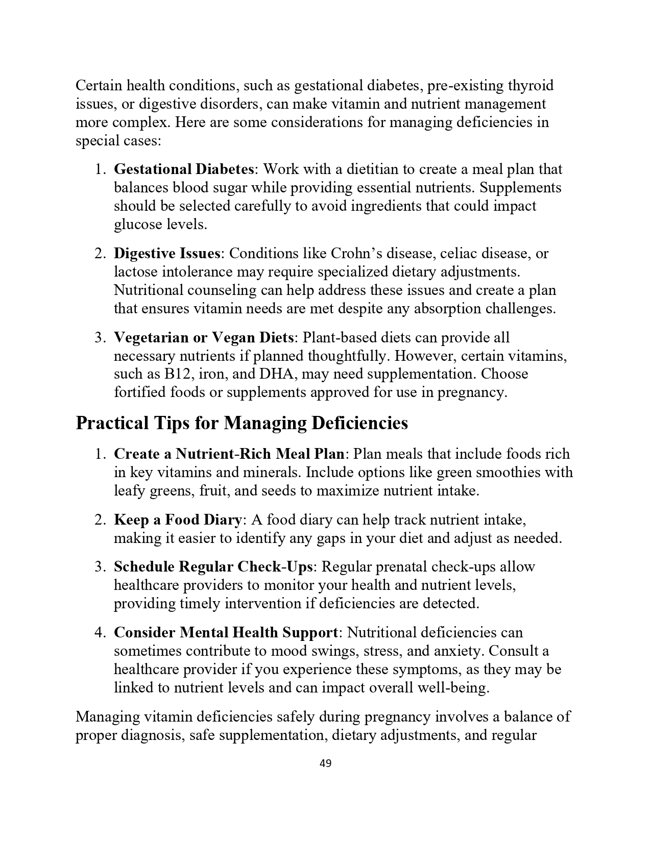 - Practical Guidance: Learn how to identify and manage vitamin deficiencies safely, with tips on dietary sources and supplementation. Our easy-to-follow meal plans and recipes are designed to help you maintain a balanced diet throughout your pregnancy.