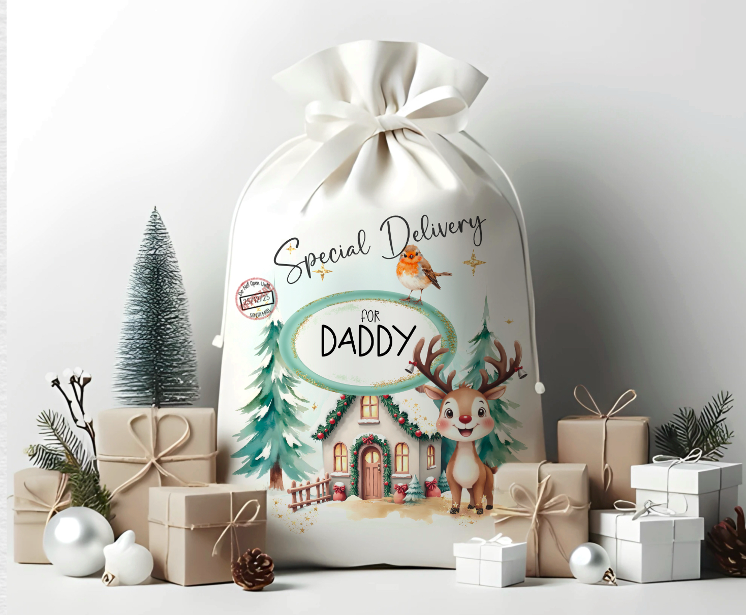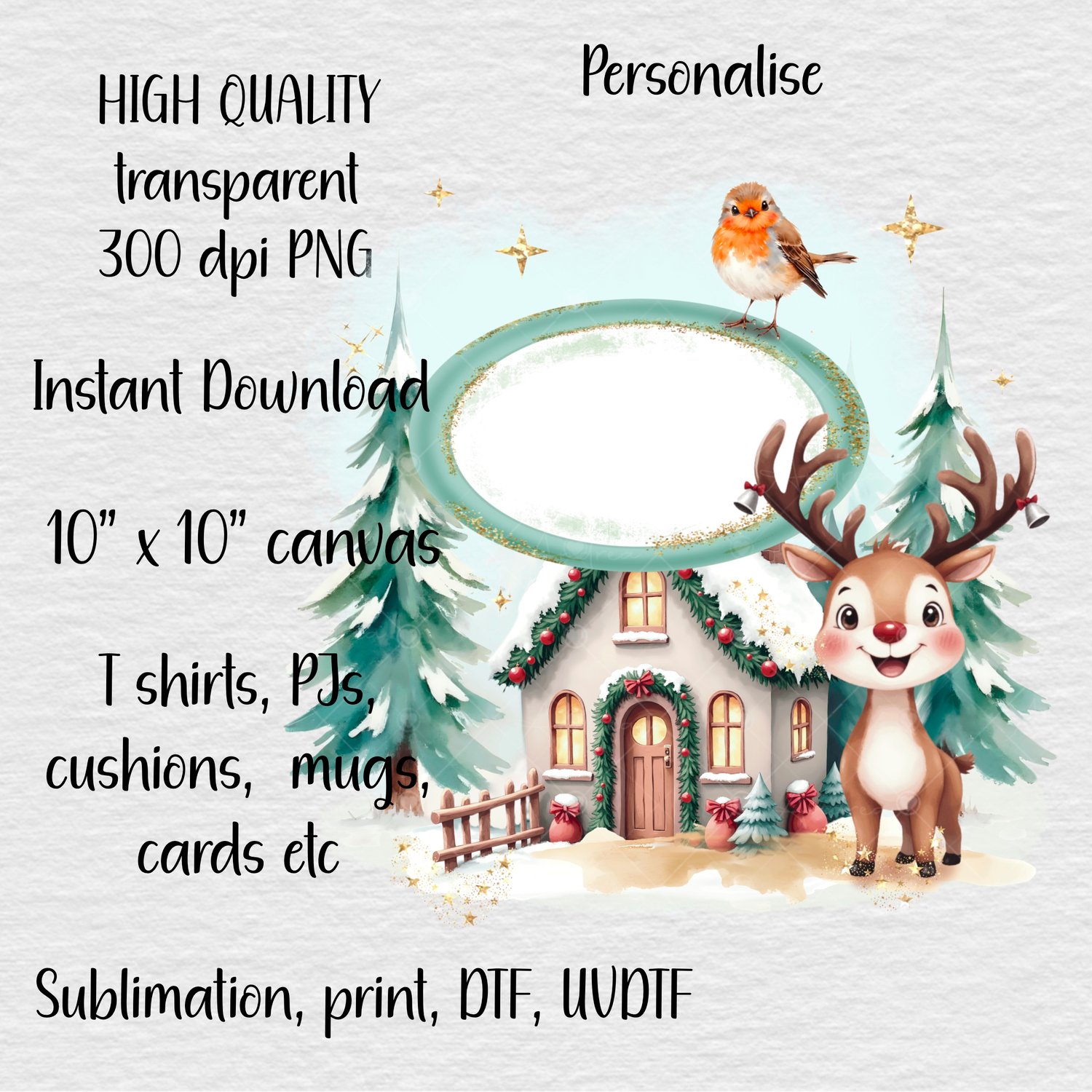 Christmas scene to personalise, reindeer, robin. Cards, clothing, gift bags and more, Sublimation, print, DTF, UVDTF. Christmas PNG.