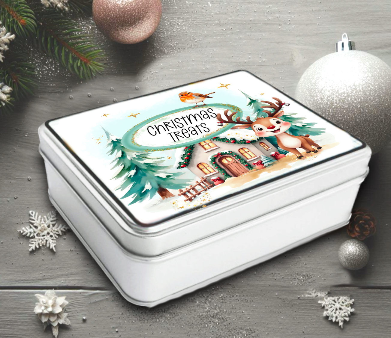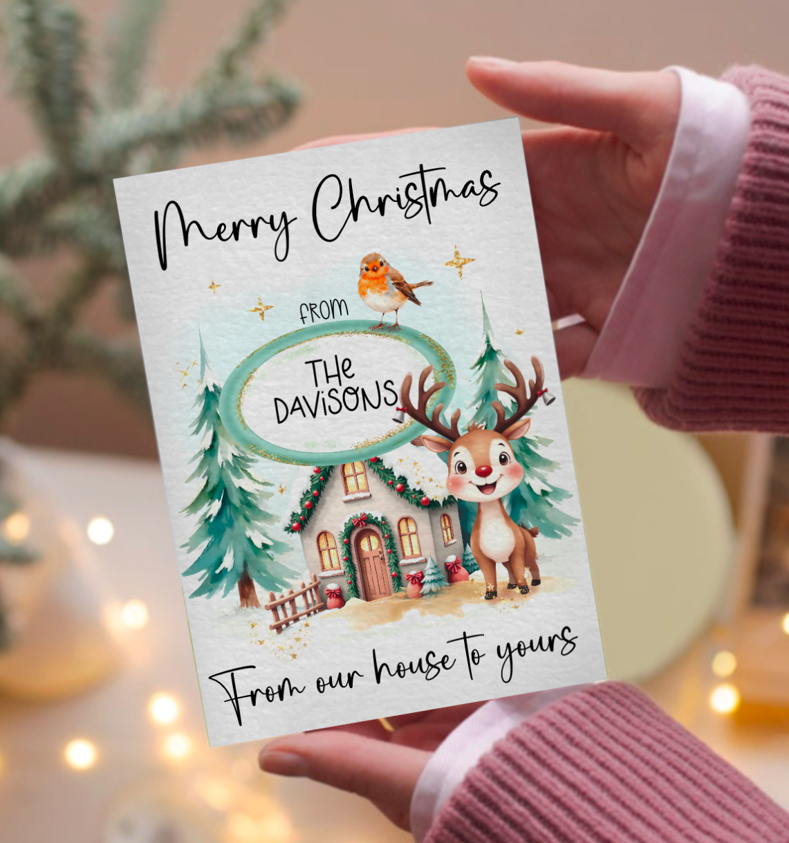 Christmas scene to personalise, reindeer, robin. Cards, clothing, gift bags and more