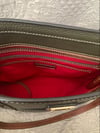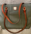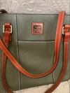 Army green color with medium brown double shoulder straps. Red fabric interior with zipper pouch and additional pockets.