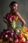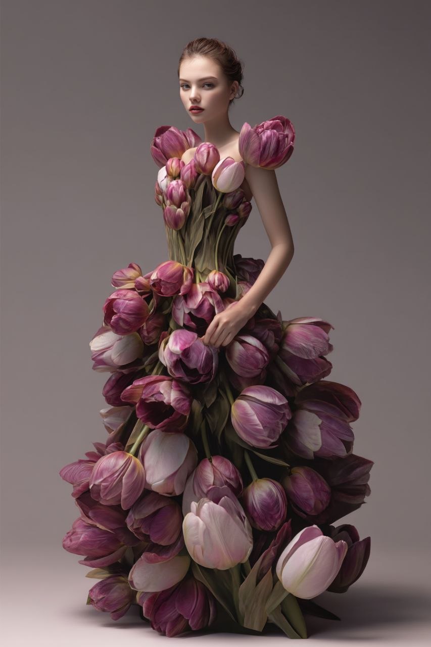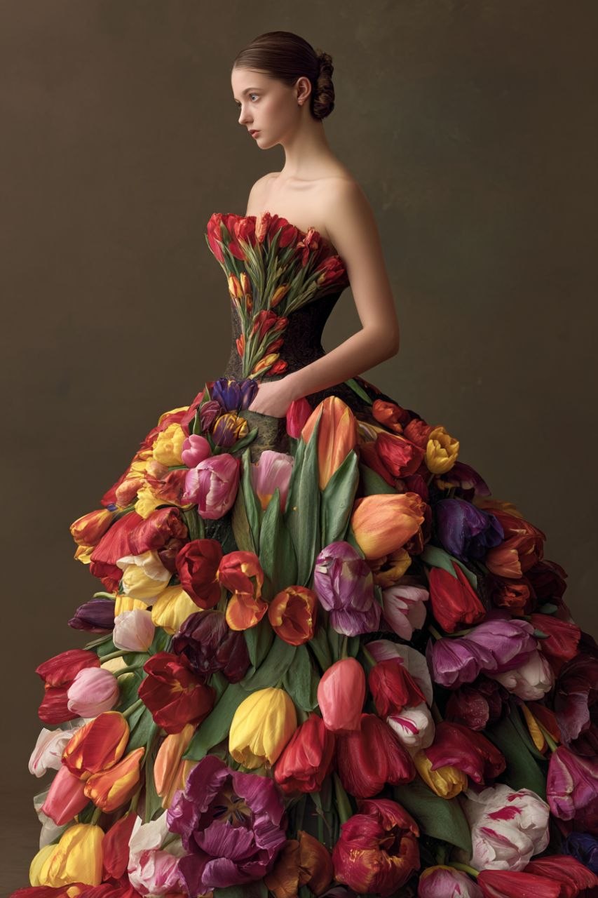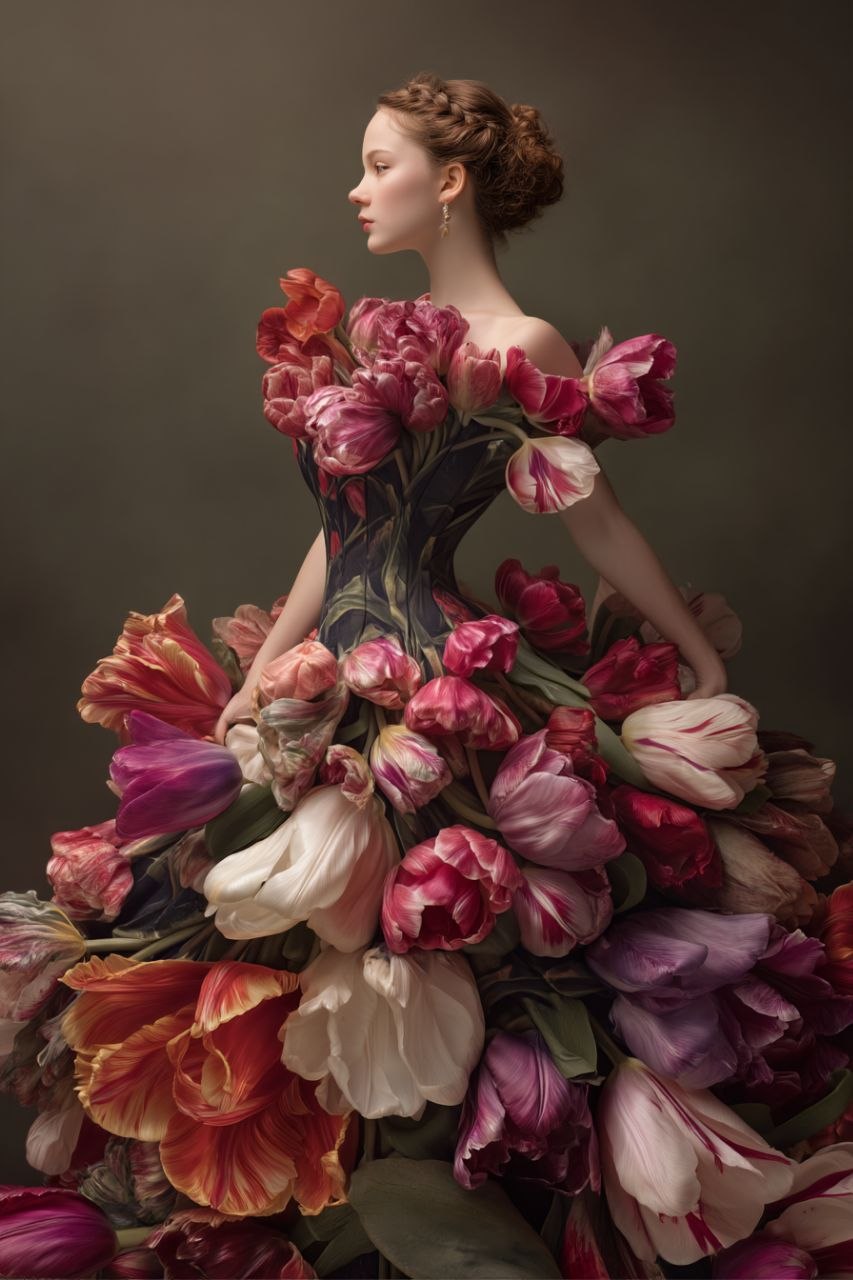 Premium MidJourney AI Prompt – Hyperreal Tulip Couture Dress Portrait