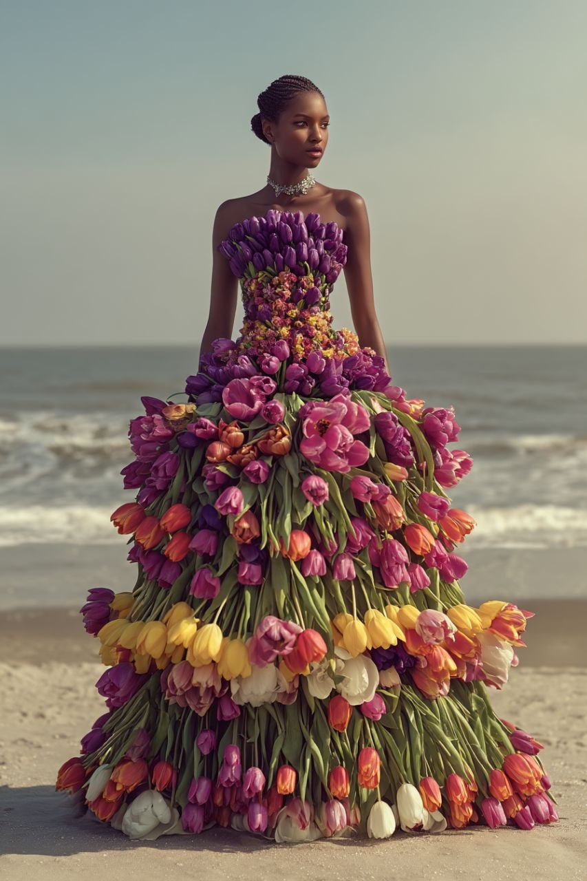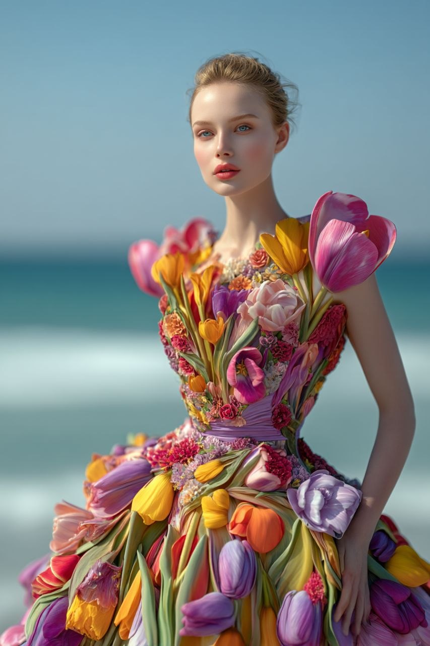 Bring couture fantasy to life with this premium MidJourney AI prompt. Generate a hyperreal portrait of a woman wearing a luxurious tulip-inspired dress, featuring stacked multicolored tulips, a thin waist, and a flowing trumpet silhouette. Set against a serene sea beach background, this prompt highlights elegance, beauty, and fashion-forward design with baroque and tumblr-style aesthetics. Perfect for fashion designers, artists, and creatives, this is a ready-to-use AI prompt for generating professional-quality imagery—not a pre-made image—giving you full creative control to produce stunning, colorful, high-resolution, couture-style visuals for any project.