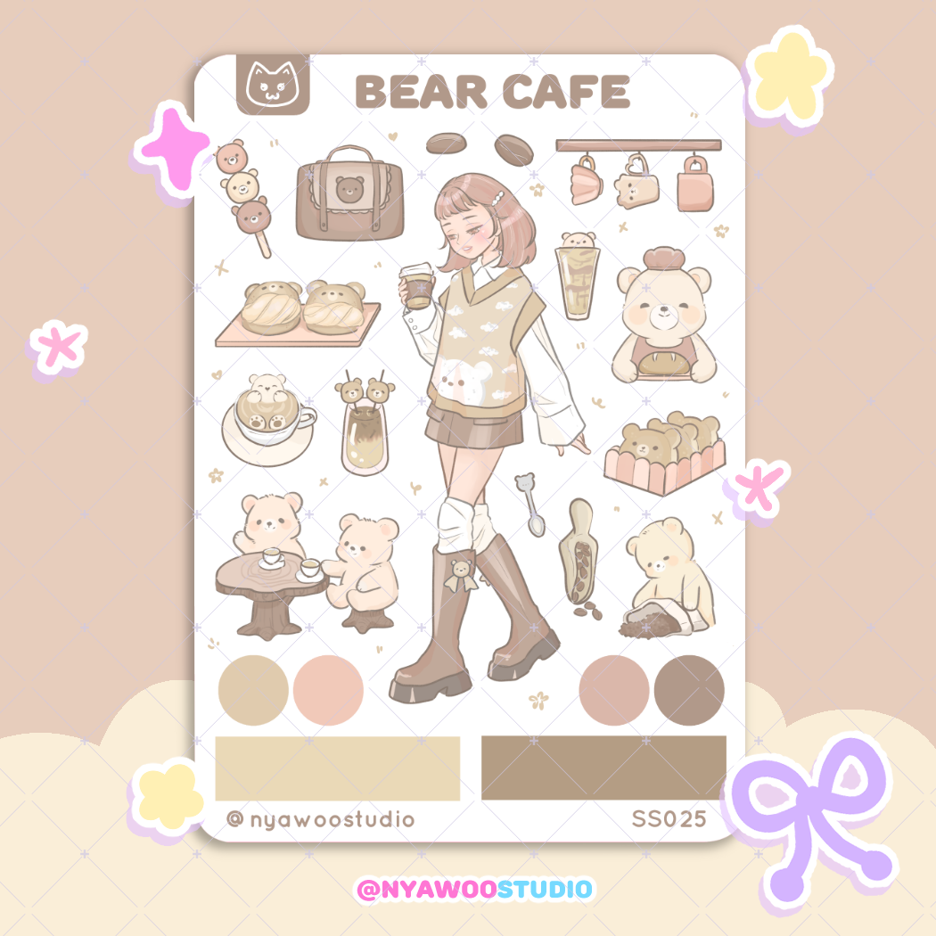 Bear Cafe Sticker Sheet | Pastel Coffee Aesthetic Stickers for Planners, Scrapbooks, Journals | Cute Foodie Stationery for Coffee Lovers