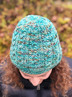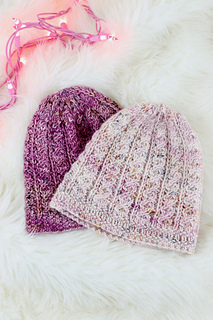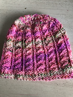 This cute little hat knits up quickly and was designed to show off speckled yarn. I fell in love with the pale pink Spun Right Round DK so bought a friend for it (as one does.)