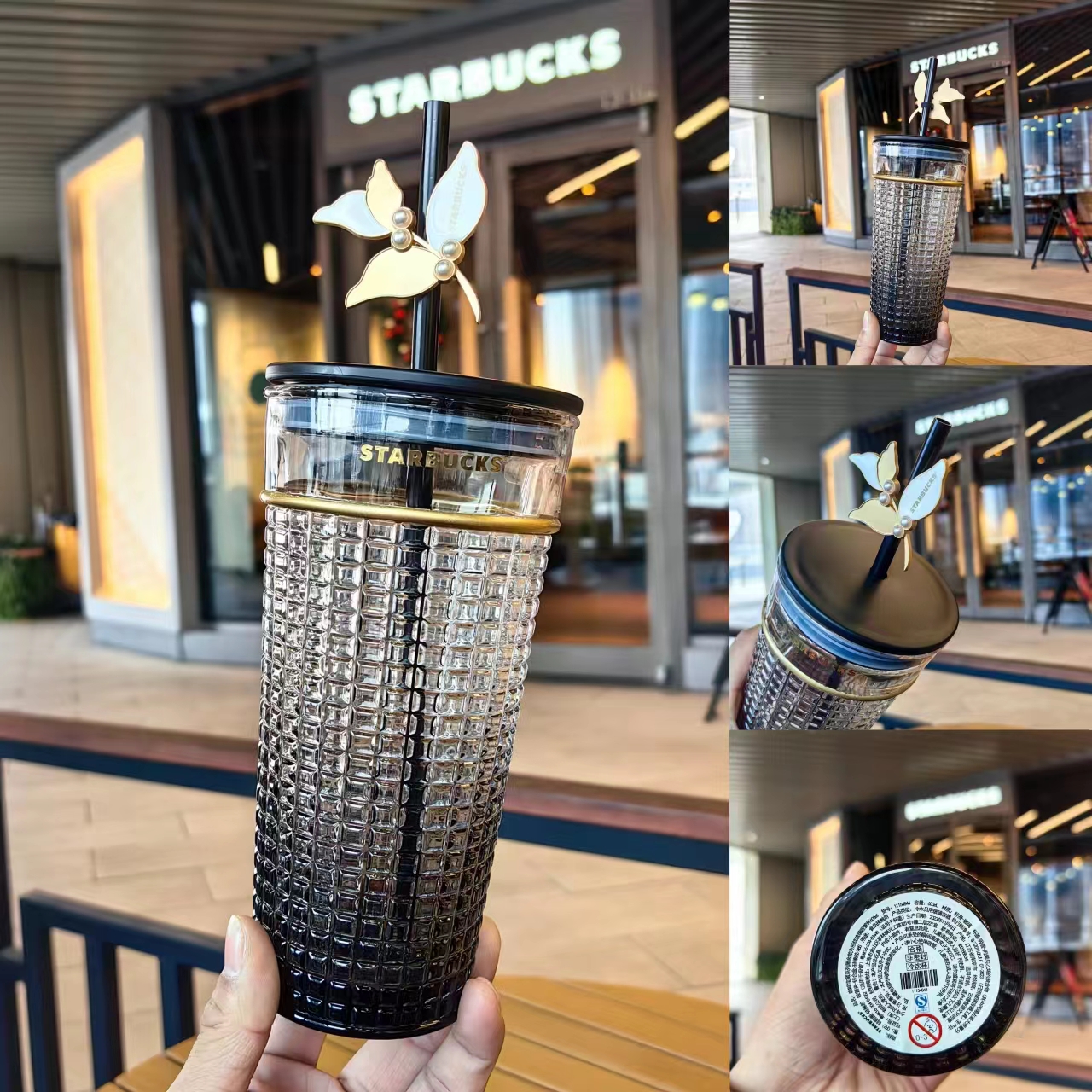 2023 Starbucks China Black-Gold 21oz Glass Jewel-studded Tumbler with Metal and Faux Pearl Leaves & Berries Straw Topper