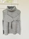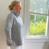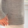 The front and back are then separated at the armholes and worked separately with shoulder short rowing and neck shaping on both sides. The front and back are then joined using a 3-needle bind off technique. The mock/ turtle neck is then knit, followed by the sleeves, both of which are worked in the round.