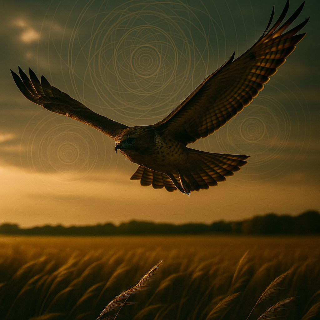Across the plain, the hawk moves with authority written in air. Each wingbeat trembles the field below, summoning stillness in prey and obedience in silence. Hunger here is not mere need — it is law, shaping grasses, winds, and creatures alike into its dominion.
