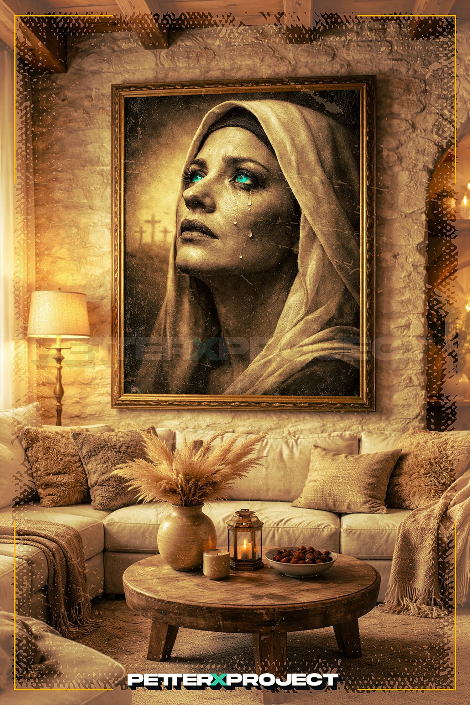 Diseñada tanto para uso digital como para impresión en alta calidad, esta pieza destaca como póster, cuadro o canvas, ofreciendo una interpretación cruda, emocional y artística de lo sagrado.