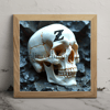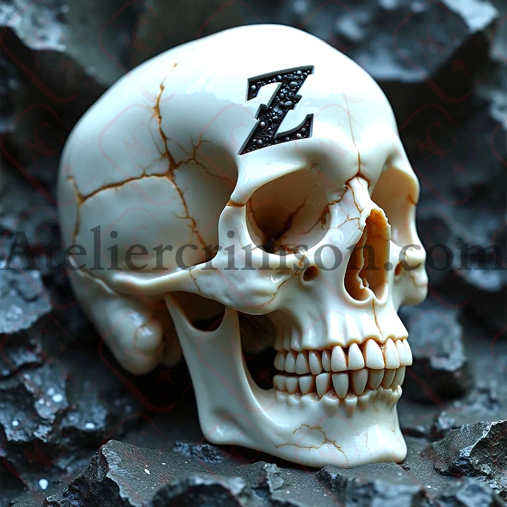 The letter Z skull obsidian marble deeply engraved character on the forehead of a white marble skull. The character, filled with dark obsidian, contrasts sharply against the pale skull. Set against a black crystalline background, the skull and character dominate the image.