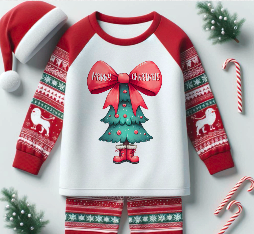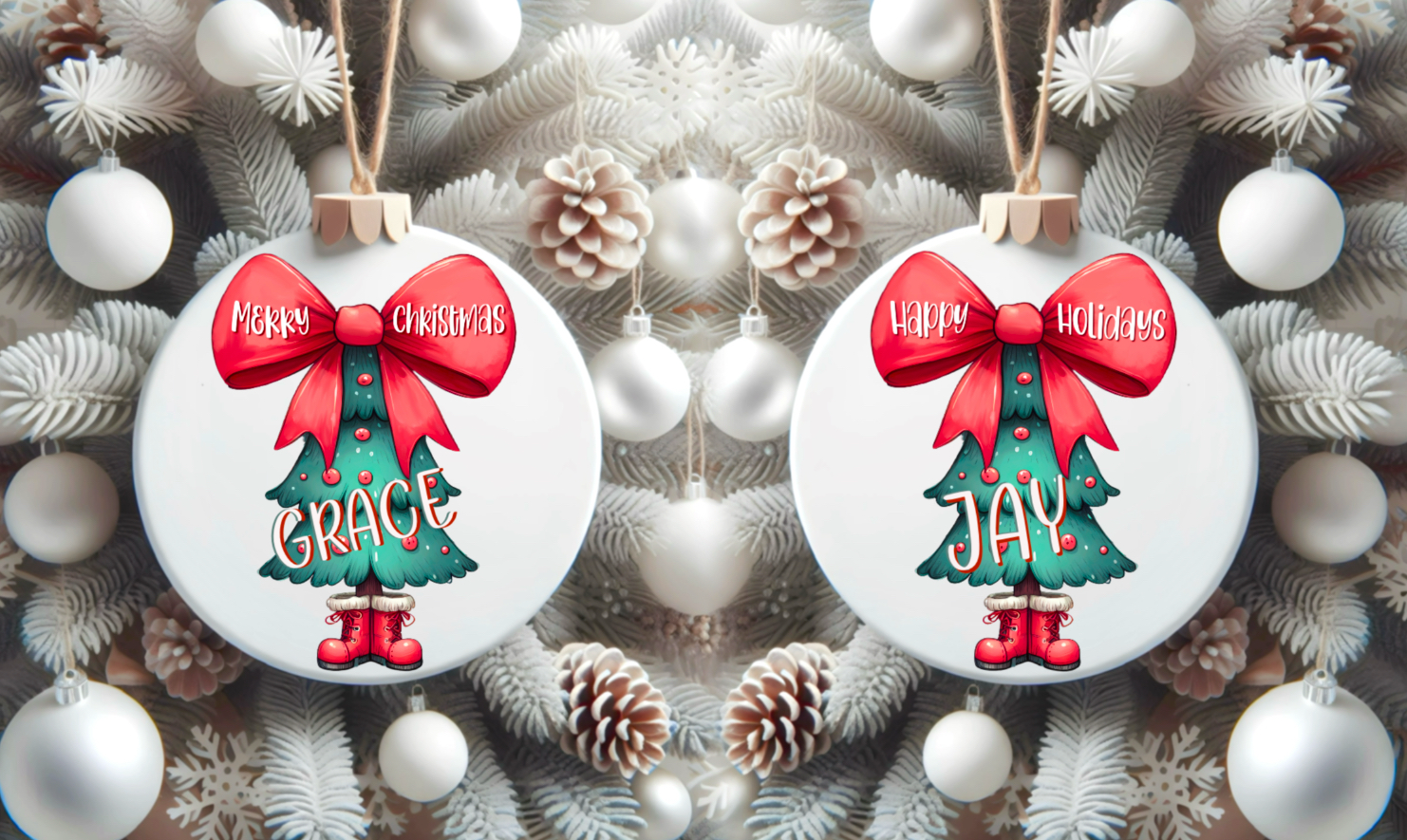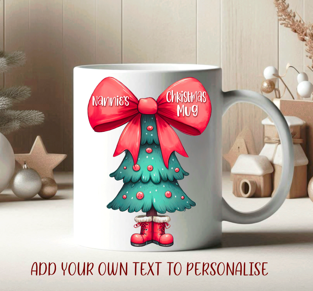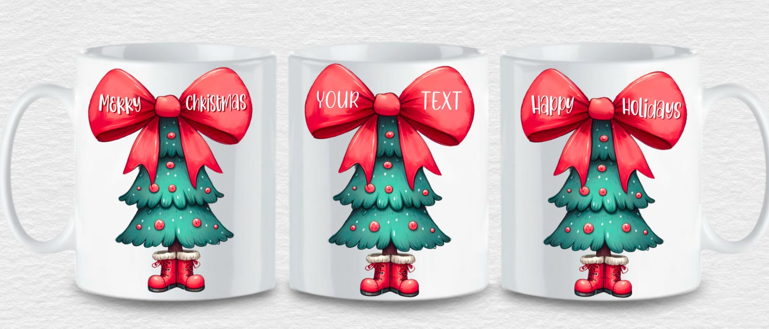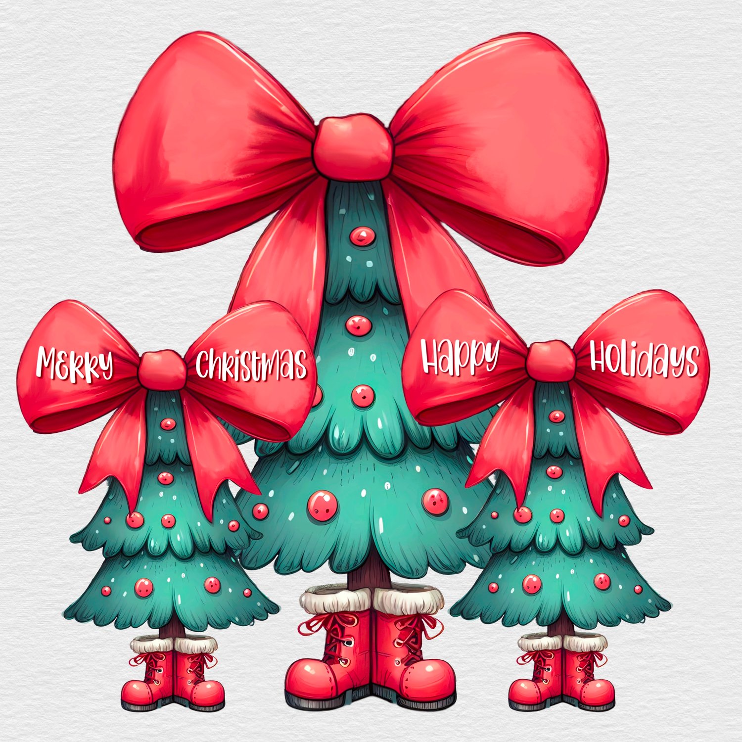 Fun Christmas tree with bow and boots, 2 with text and one blank to personalise. 3 PNGs. Sublimation, print, DTF etc. created on a large 10” x 10” canvas, Ideal for personalised gifts such as clothing, gift sacks, baubles, mugs etc.