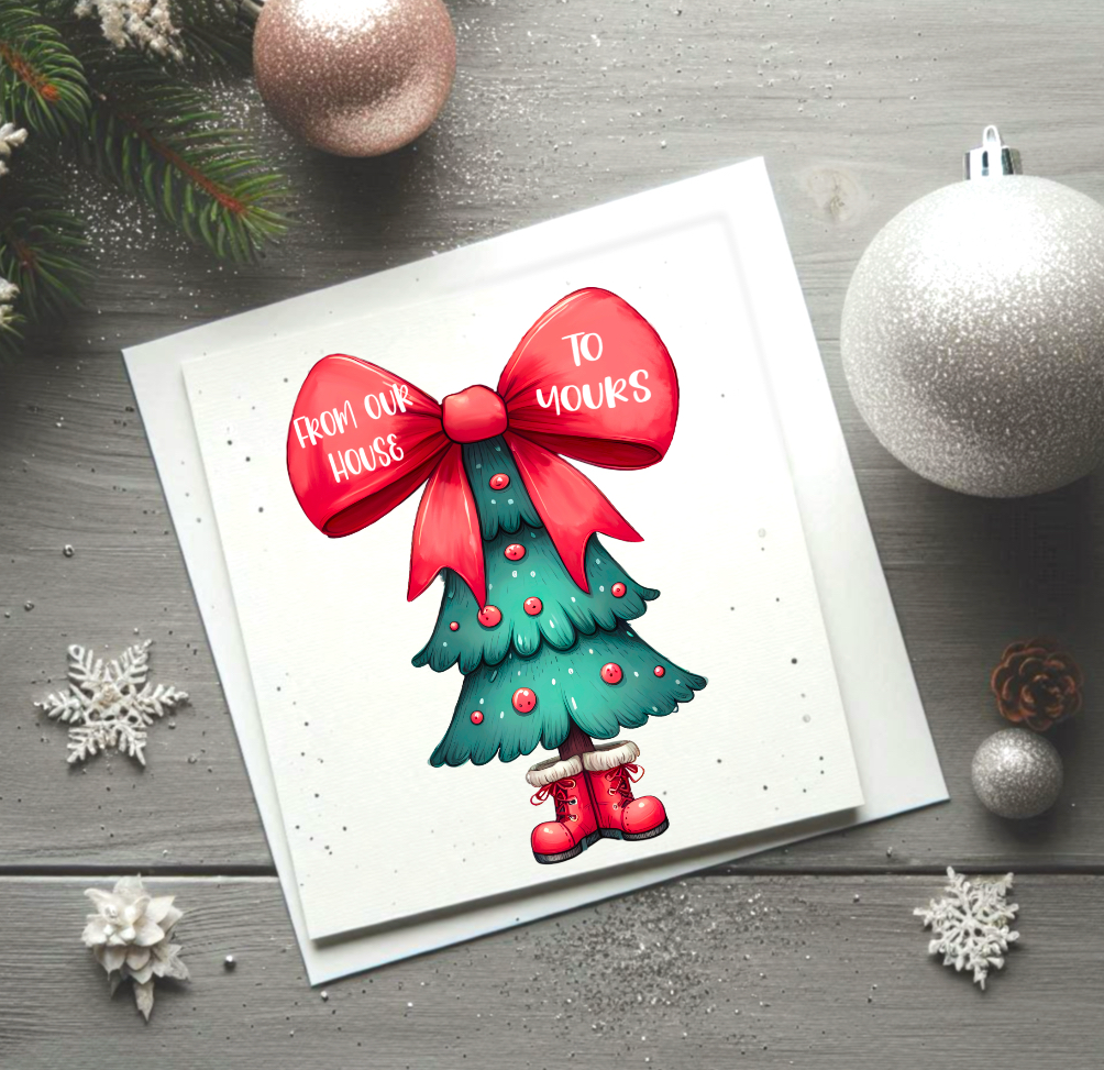 Fun Christmas tree with bow and boots, 2 with text and one blank to personalise. 3 PNGs.