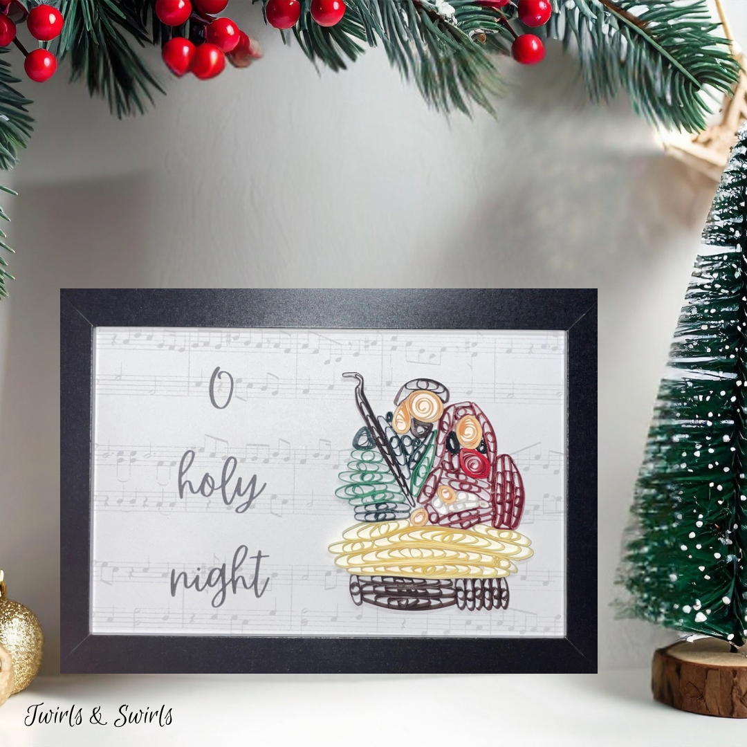 This hand-quilled nativity scene beautifully captures the stillness and sacred wonder of that first Christmas night. Each delicate coil and curve forms a tender picture of Mary, Joseph, and the newborn Savior—wrapped in love, light, and peace. Whether displayed on your mantle or gifted to someone who treasures the meaning of the season, this piece reminds us of the night when hope was born into the world.