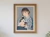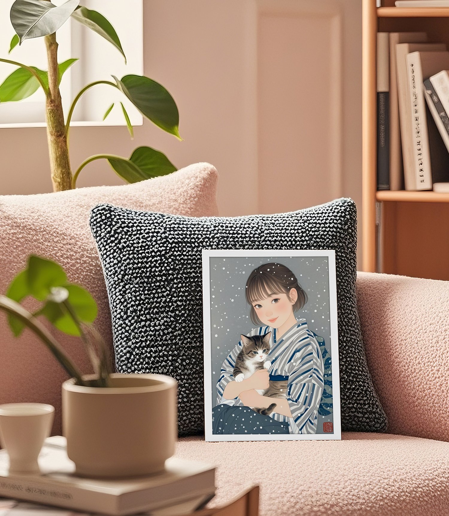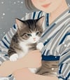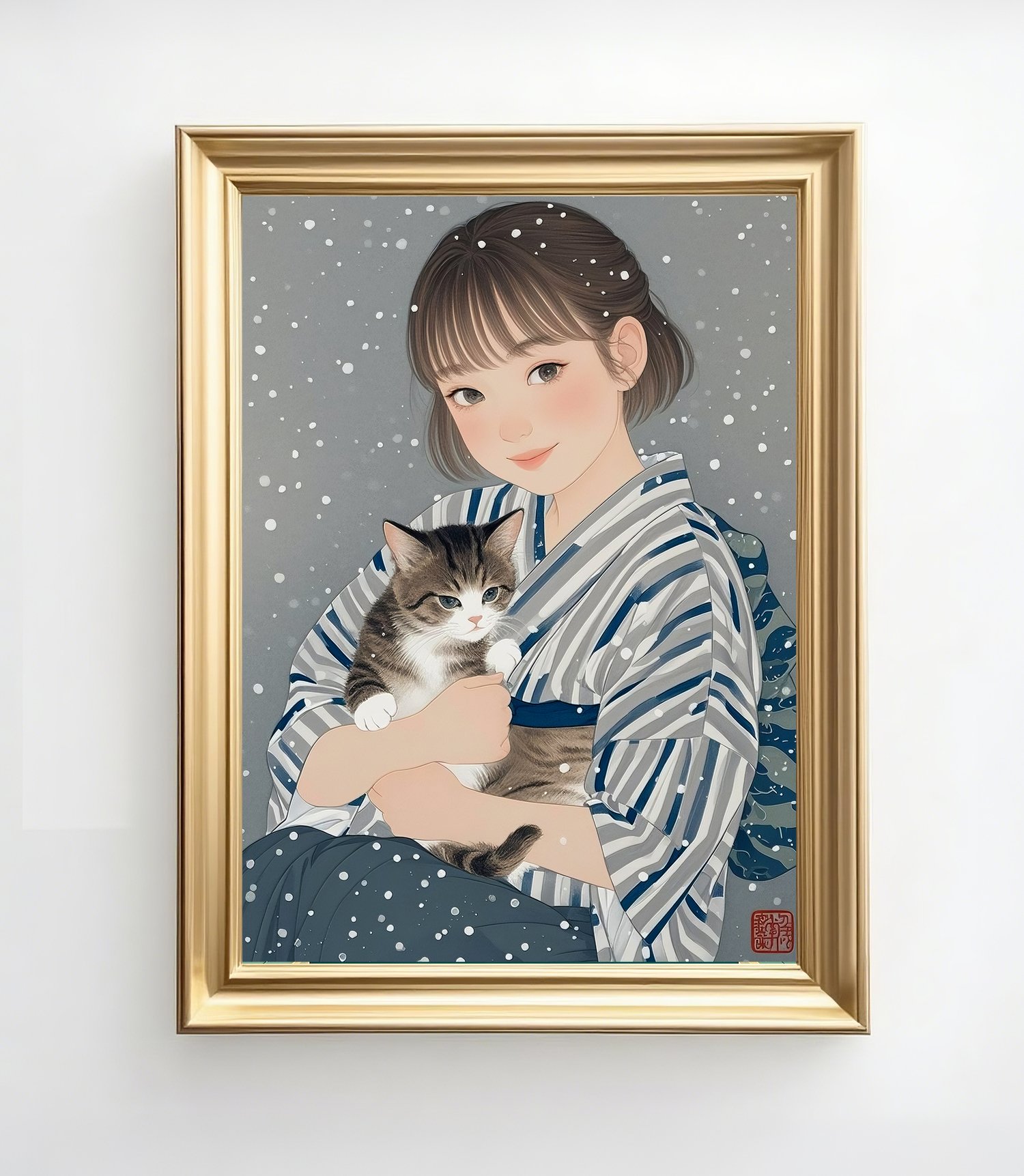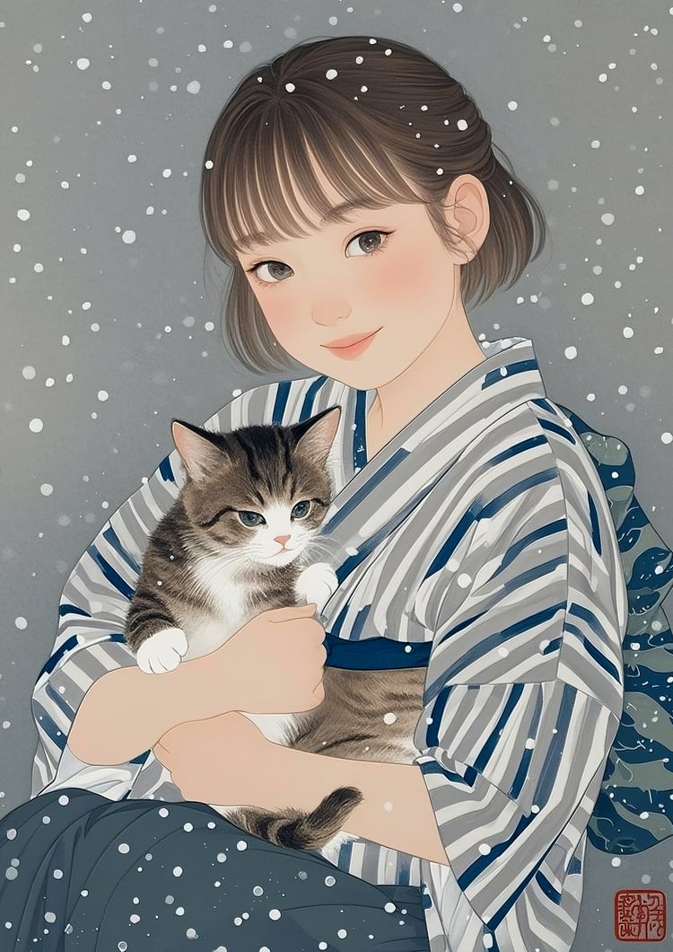 The striped kimono with blue tones creates a sense of elegance and serenity, perfectly harmonizing with the overall composition. Details such as the blush on the girl’s cheeks and the fine texture of the cat’s fur show careful attention to detail, adding depth and realism to the piece.