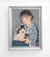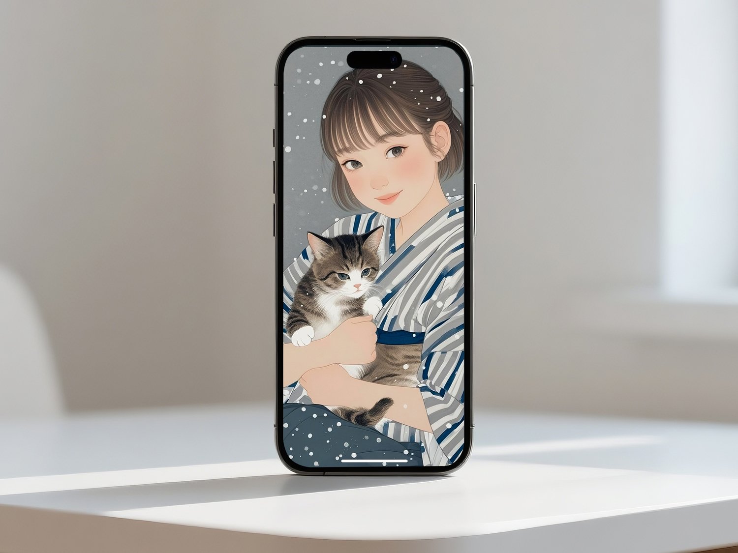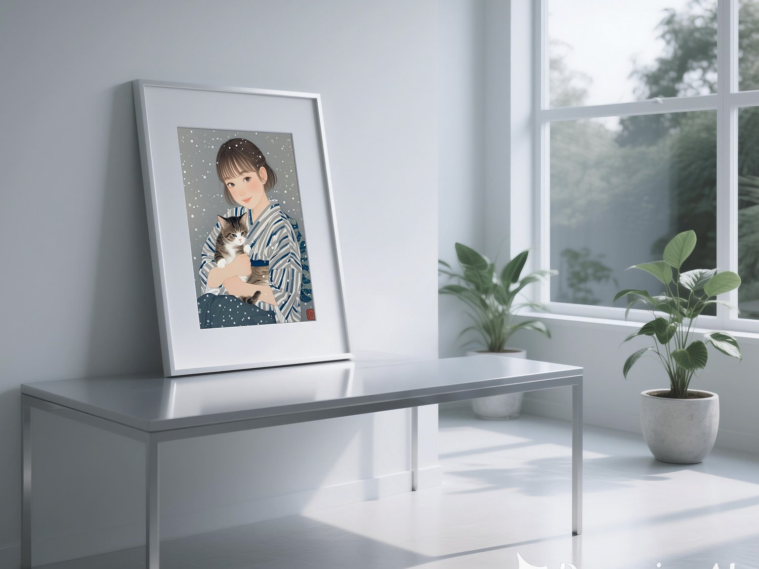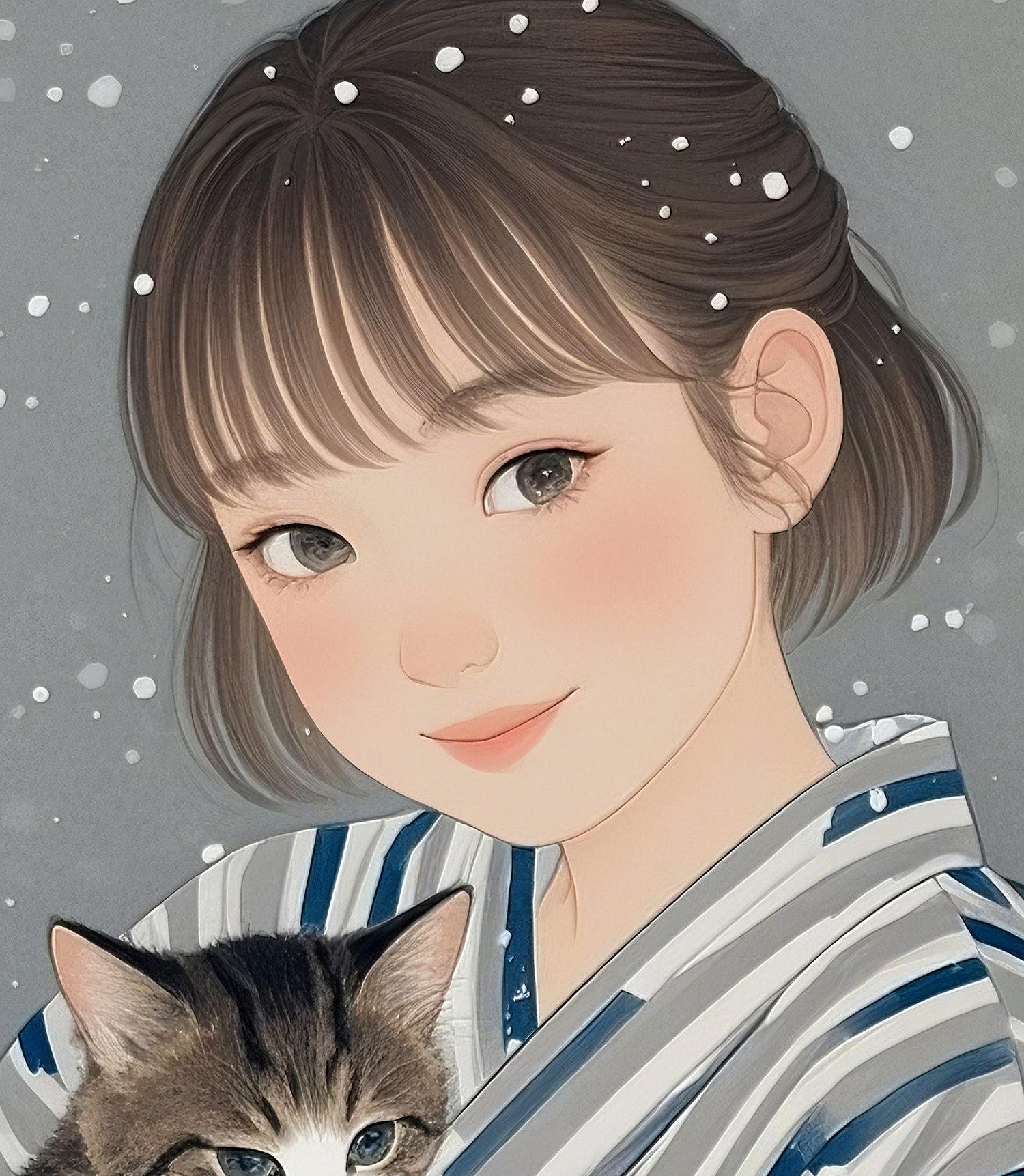 This artwork conveys a delicate and gentle atmosphere with remarkable beauty. The snowy background enhances the sense of winter’s stillness while simultaneously highlighting the warmth shared between the girl and the cat. Her soft expression and the cat’s calm demeanor evoke a comforting and soothing feeling for the viewer.