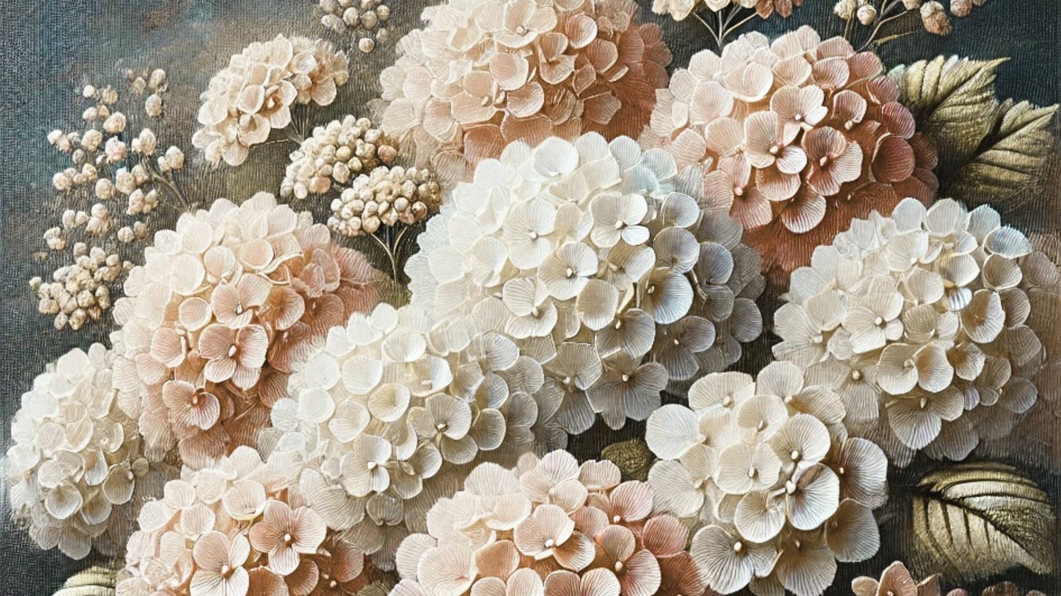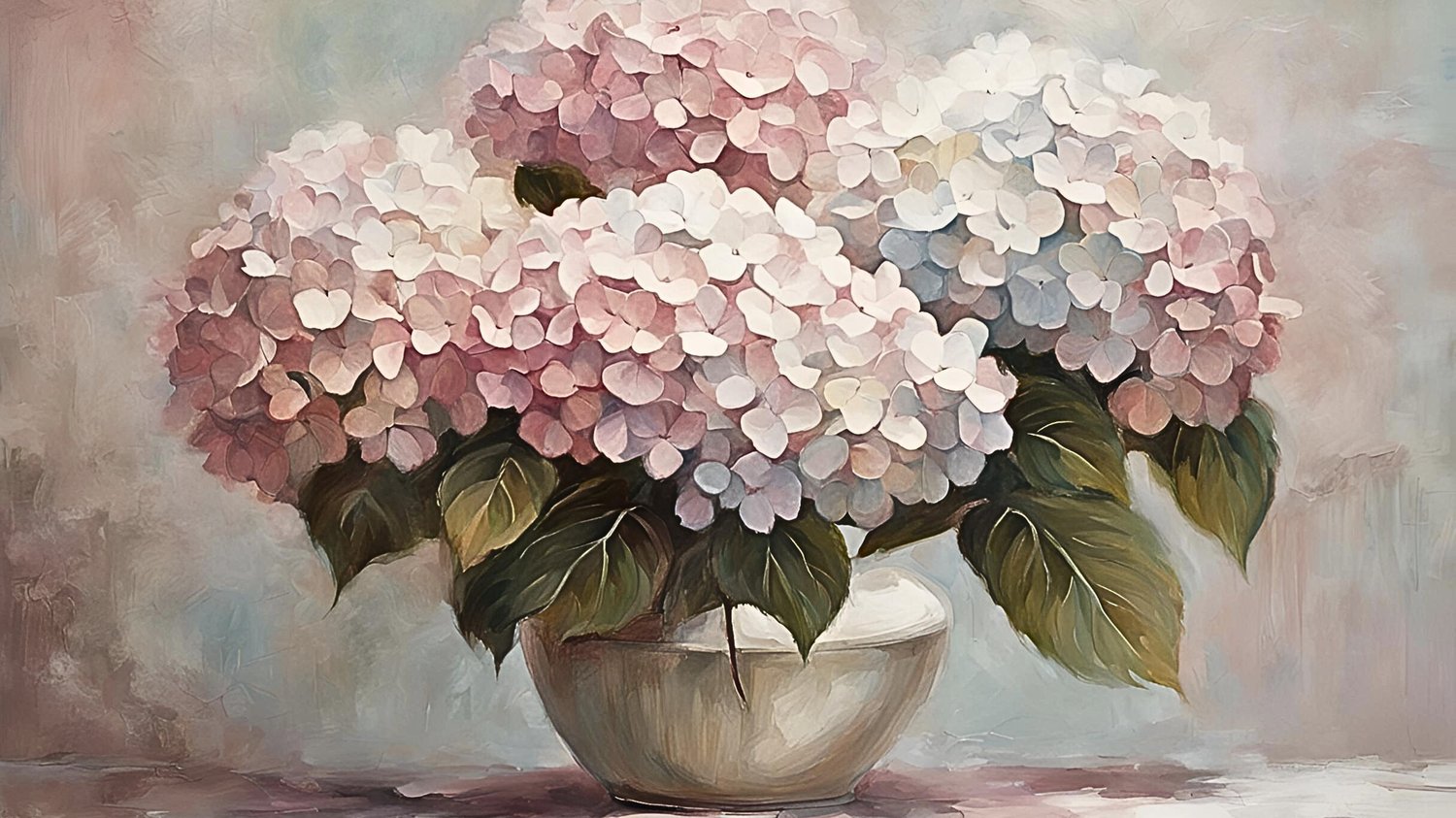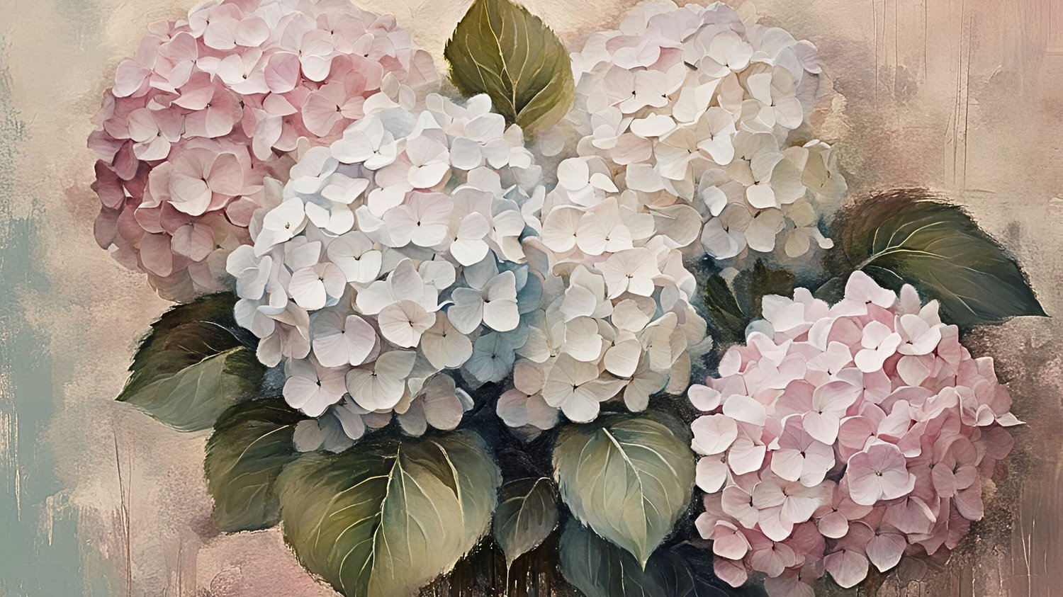 - Soft pastel hydrangeas in pinks, white, and pale blue hues