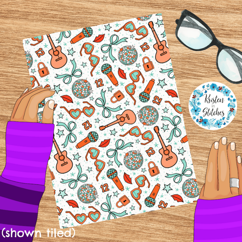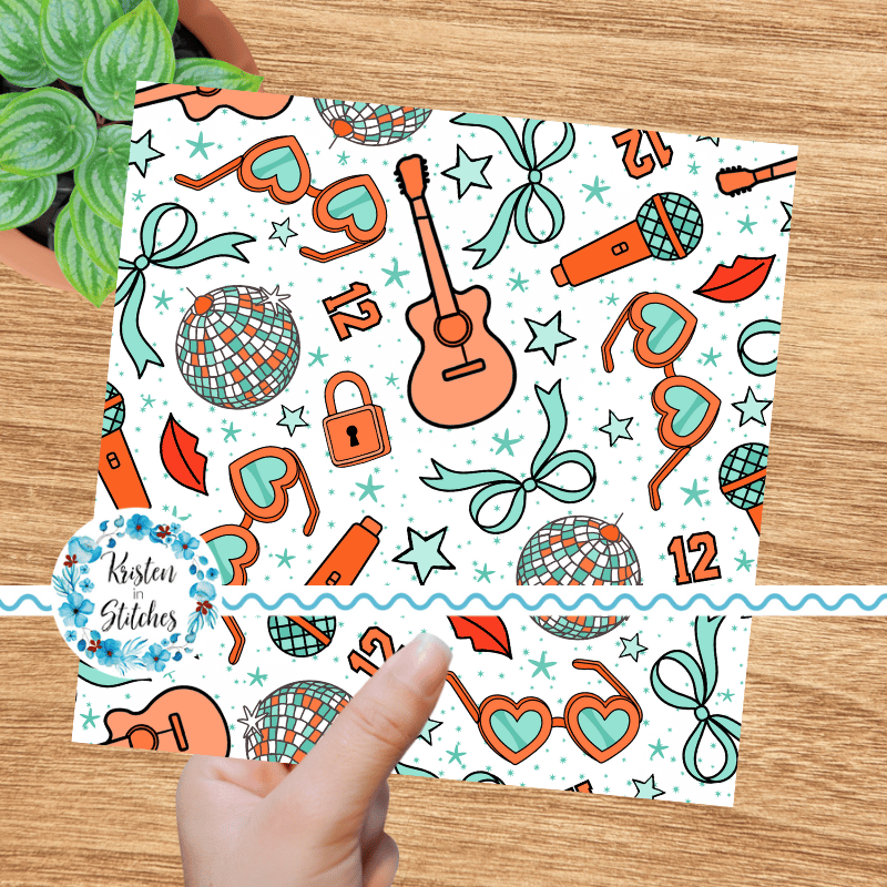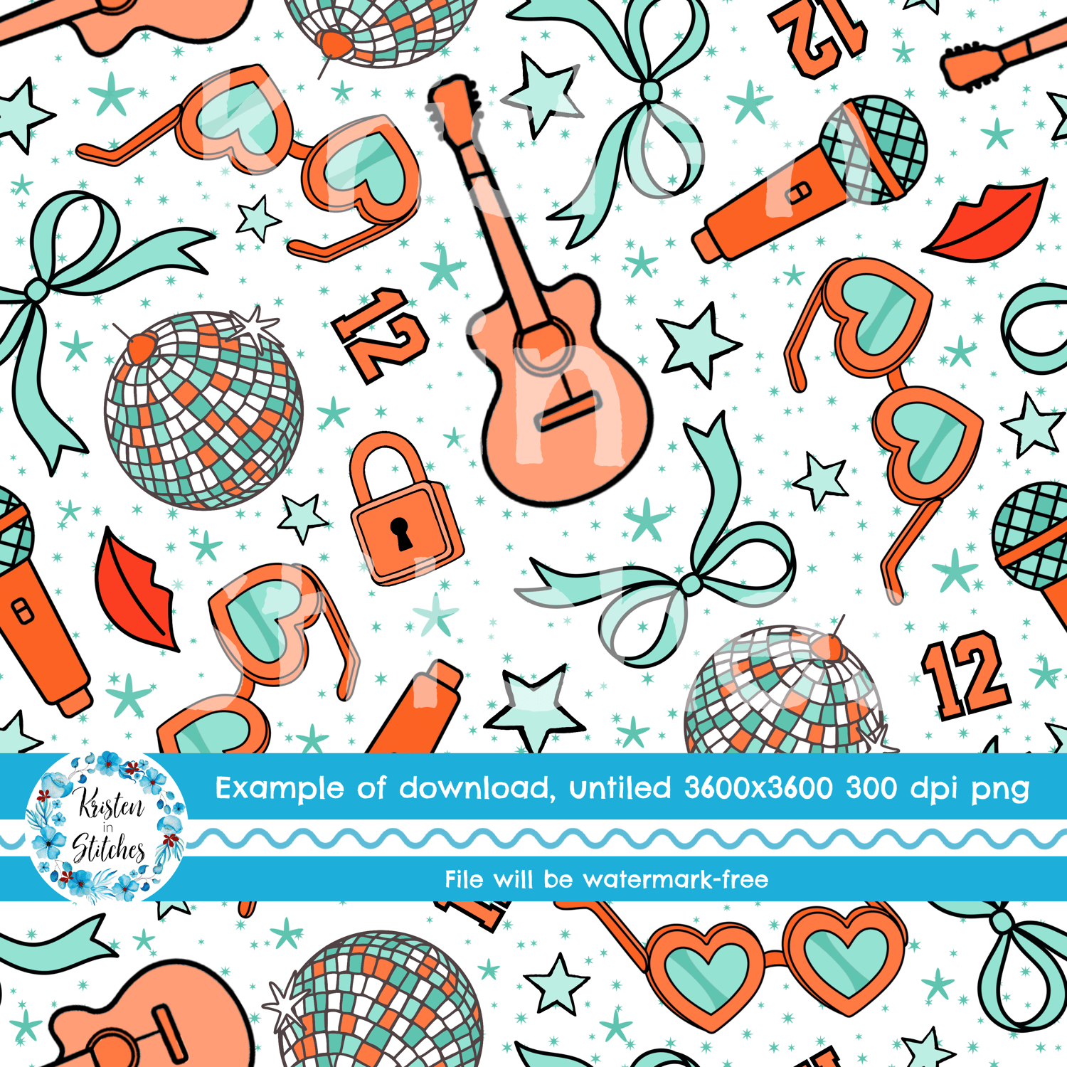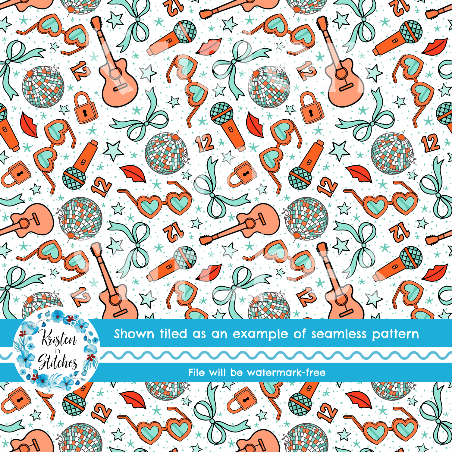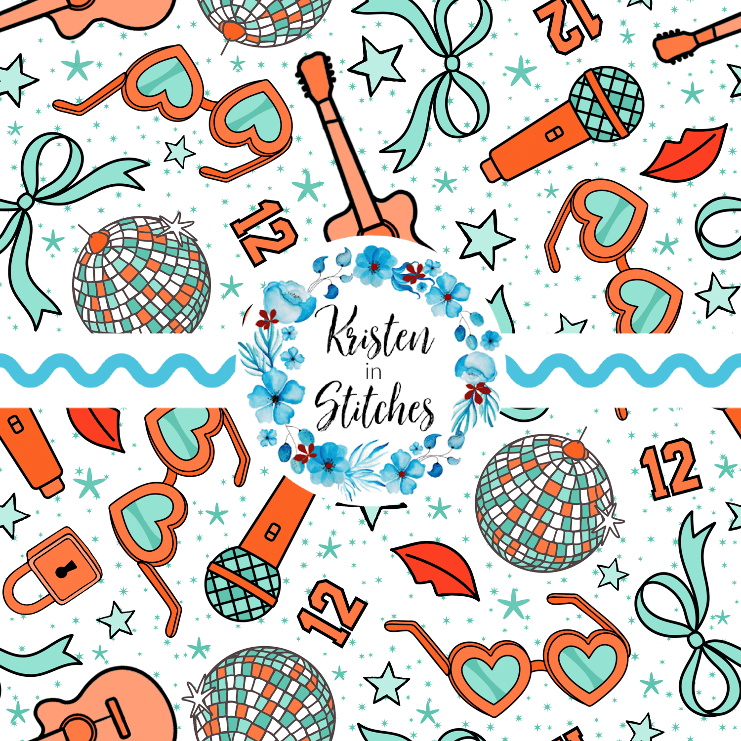 Life of a Showgirl icons in orange and mint green album colors, including disco balls, guitars, orange locks, microphones, coquette ribbon bows, lipstick and more.