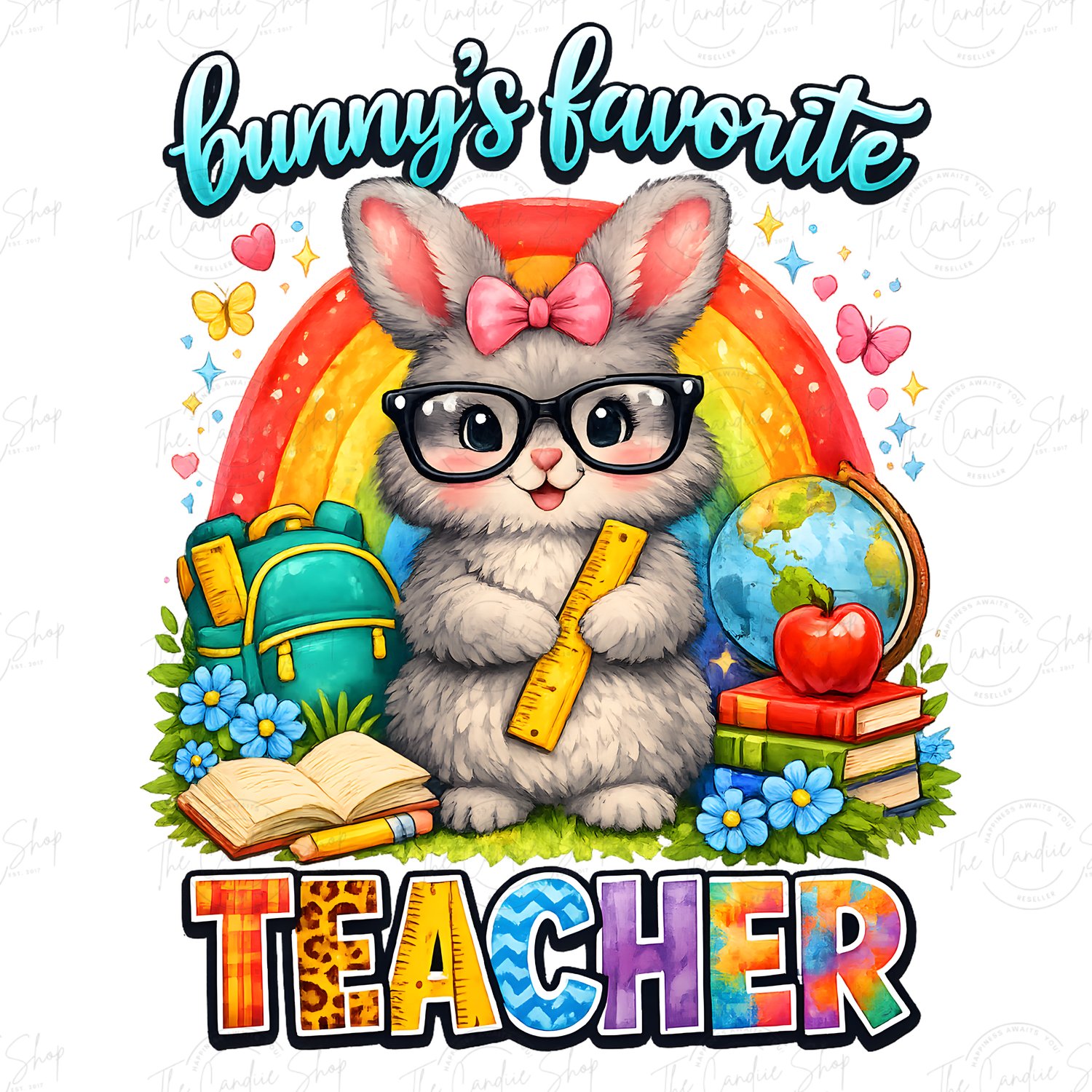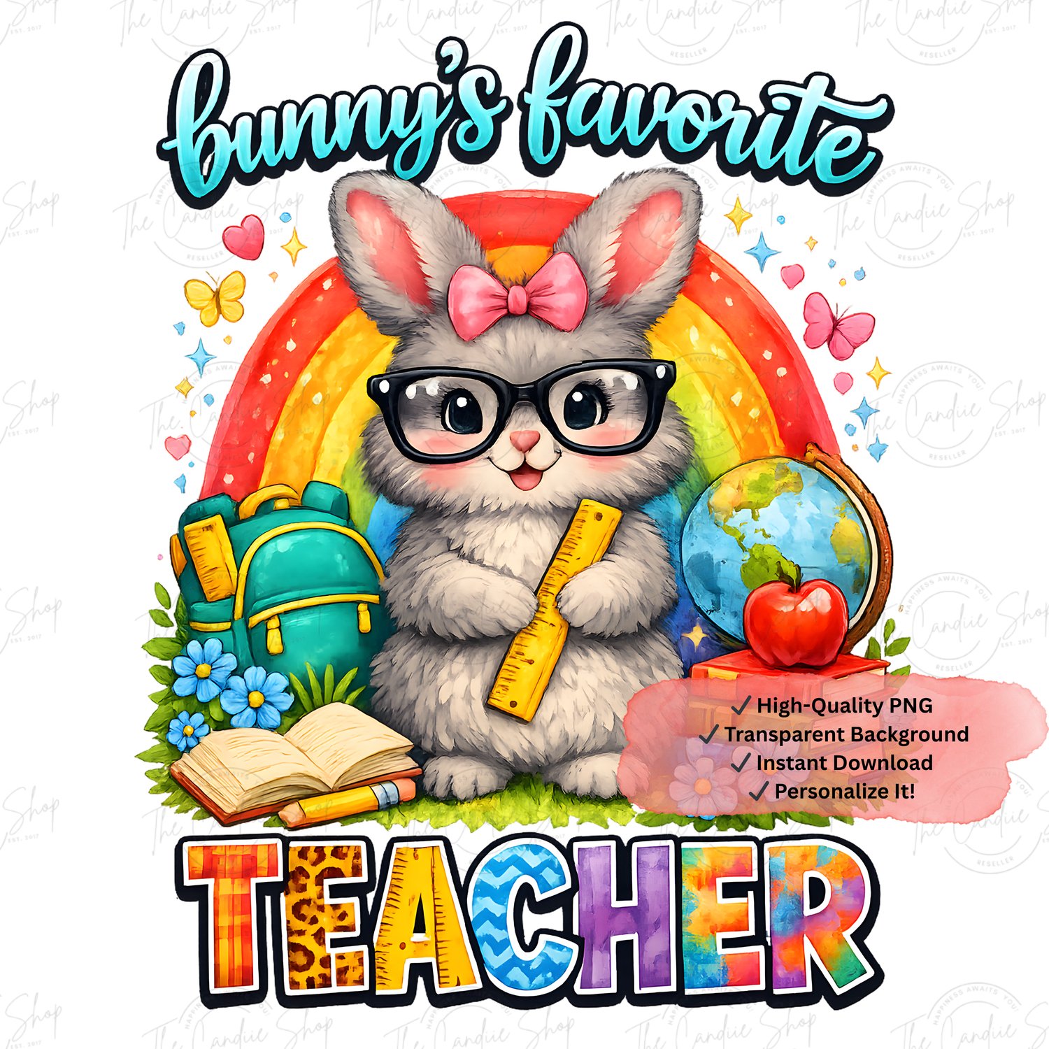 Celebrate your favorite teacher with this fun and colorful Bunny’s Favorite Teacher PNG design! This high-quality digital download features a cute school-themed bunny with classroom elements, a rainbow backdrop, and bright teacher-inspired lettering, perfect for creating t-shirts, mugs, tote bags, stickers, cards, and more.