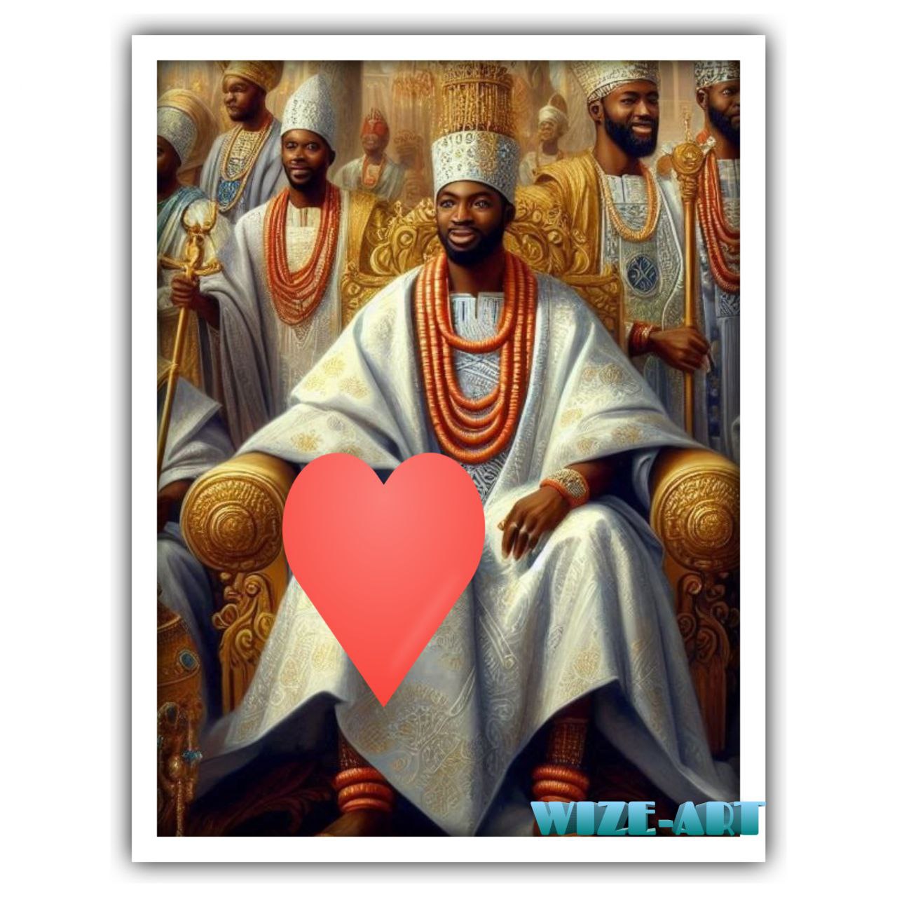 - Authentic Representation: Each artwork meticulously captures the opulent traditional attire of Yoruba royalty, featuring richly embroidered agbadas, elaborate beaded crowns, and intricate coral bead necklaces.