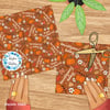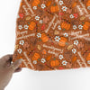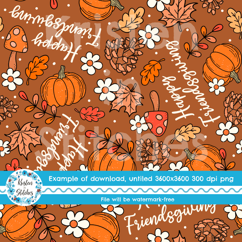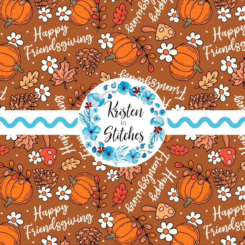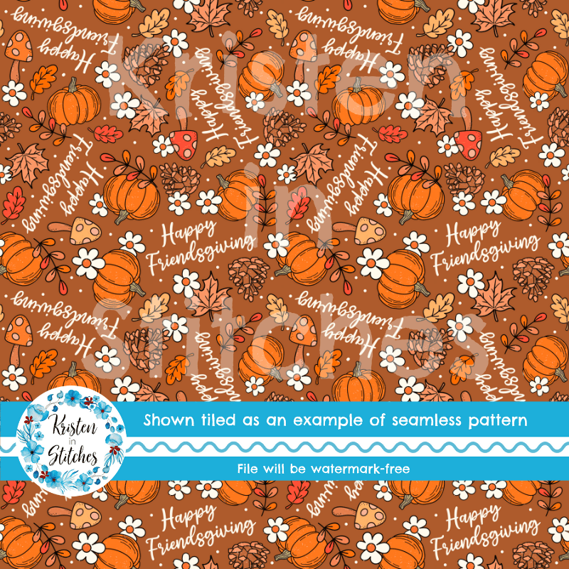 Happy Friendsgiving pattern with pumpkins, mushrooms, pine cones, leaves and daisy flowers.