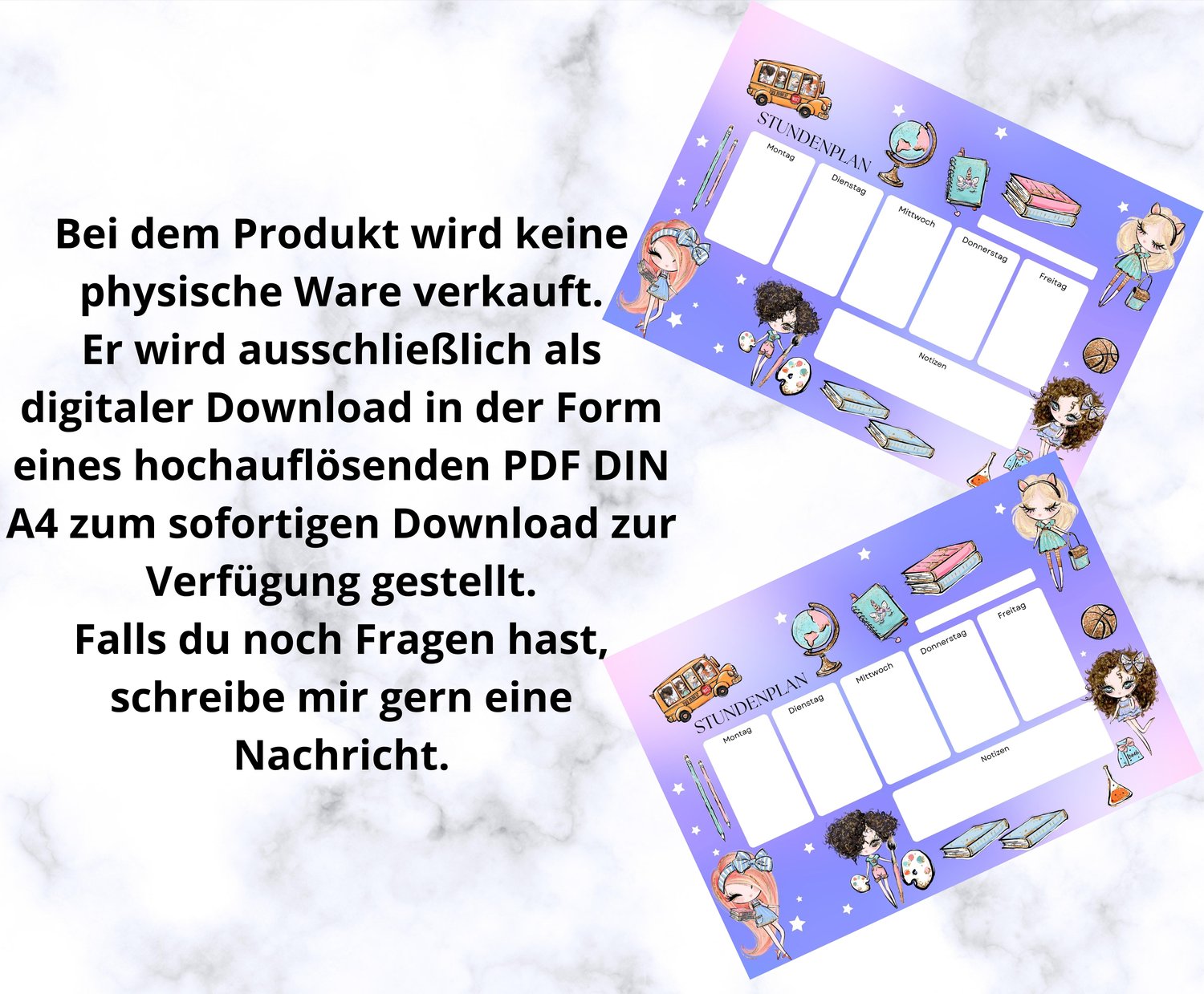 Stundenplan Wochenplan Mädchen - Zur Einschulung, Schulanfang - Geschenk für Schulkind 2022 - A4 Sofort Download und sofort Ausdruckbar