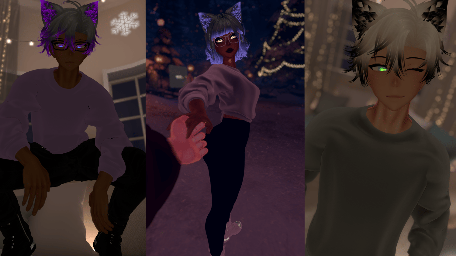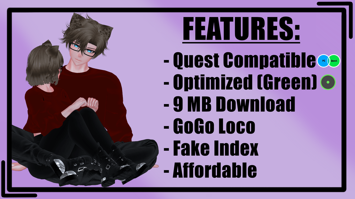 | Body by zinpia (EDITED BY ME, NO REUSE) | Female Head/Head Textures by DUCC#0008 (EDITED BY ME, NO REUSE) | Male Head/Head Textures by Starlynn (EDITED BY ME, NO REUSE) |Hair Textures by Cicieaaa#7777 | Fluff's ToolBox | VRCFury Tool | GoGoLoco by Franada | Glasses by Salted | Female Hair by Latitia | Pants by Virtual Threads | Leggings by Xero3D | Sweater by Bunisu | Boots by TheOasis/Gashina | Male Hair by Delor | Models: carnor & BOT_Alvino