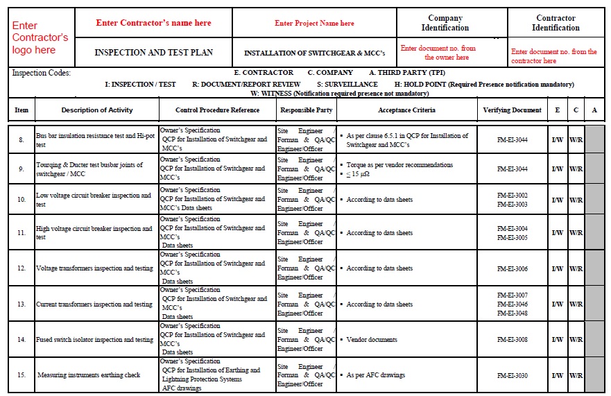 This document provides a general comprehensive template for the Inspection and Test Plan for Installation of Low and Medium Voltage Switchgear and MCC's (Motor Control Centers) used at construction sites.