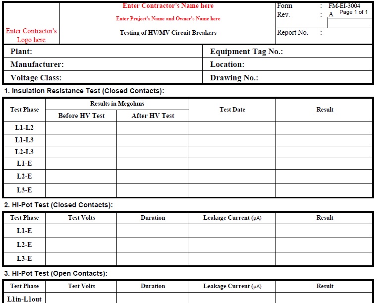 Inside this ITP for Installation of Low & Medium Voltage Switchgear and MCC's you get several documents: