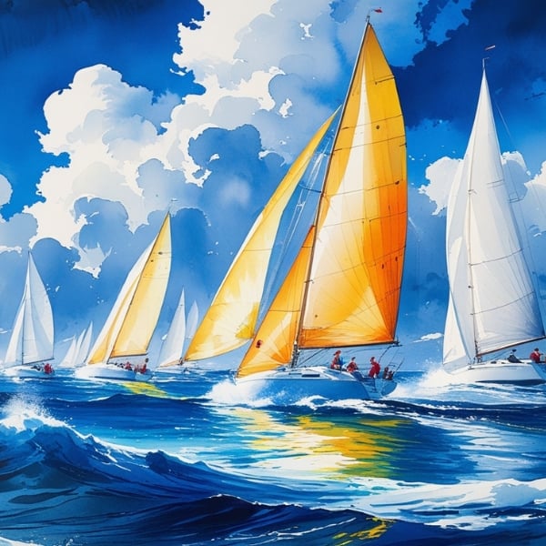 A vibrant maritime painting captures the thrill of a sailboat race across dynamic ocean waves under a dramatic sky. The scene bursts with energy, blending vivid colors and expressive brushstrokes in an impressionist style that brings the sea and sky to life.
