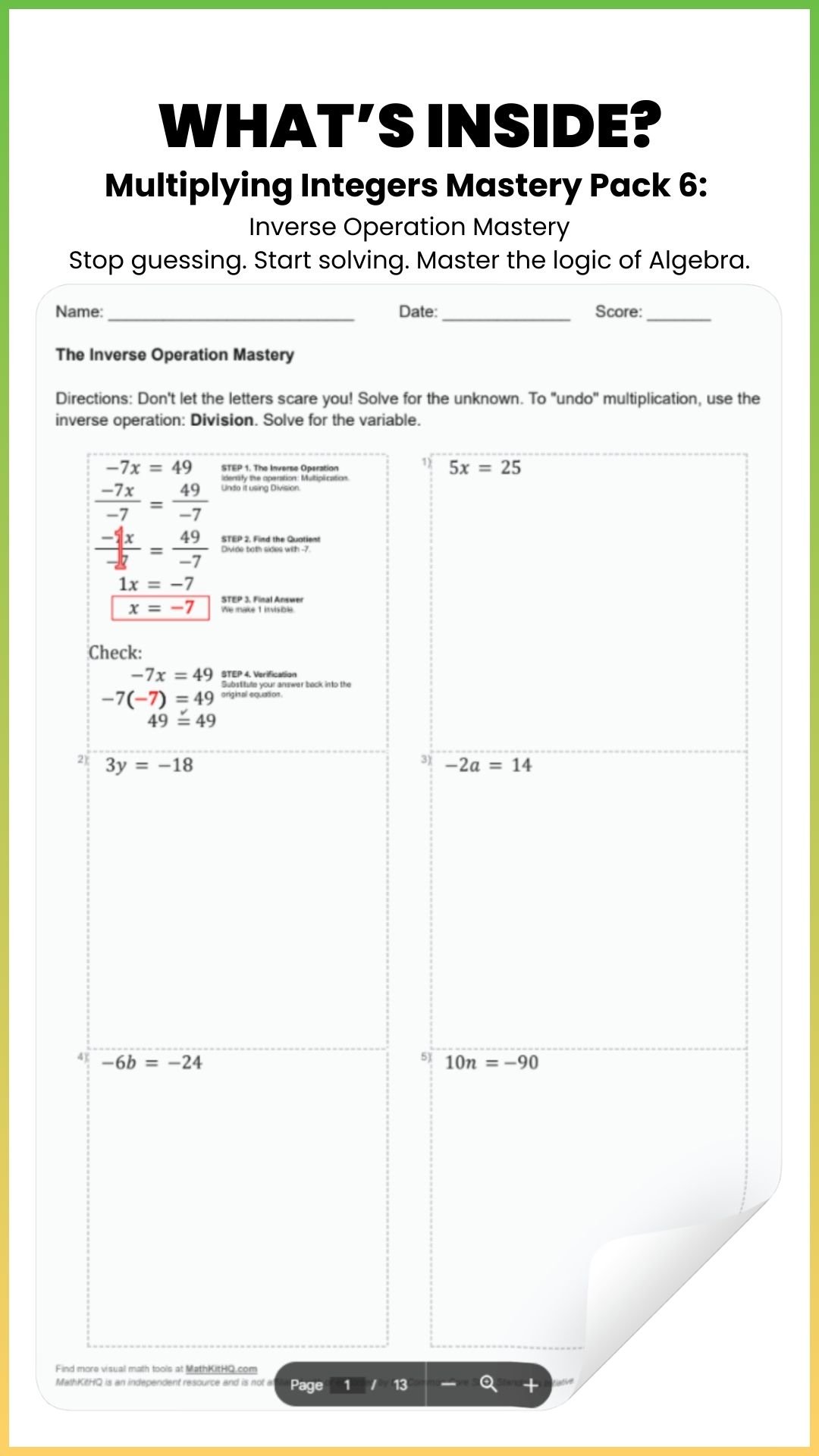 Are your students ready to move from arithmetic to equation solving? Pack 6: Inverse Operation Mastery is the most comprehensive resource in the MathKitHQ series yet. This 12-page deep-dive focuses exclusively on the logic of Inverse Operations—teaching students how to use division to "undo" multiplication and solve for the unknown.
