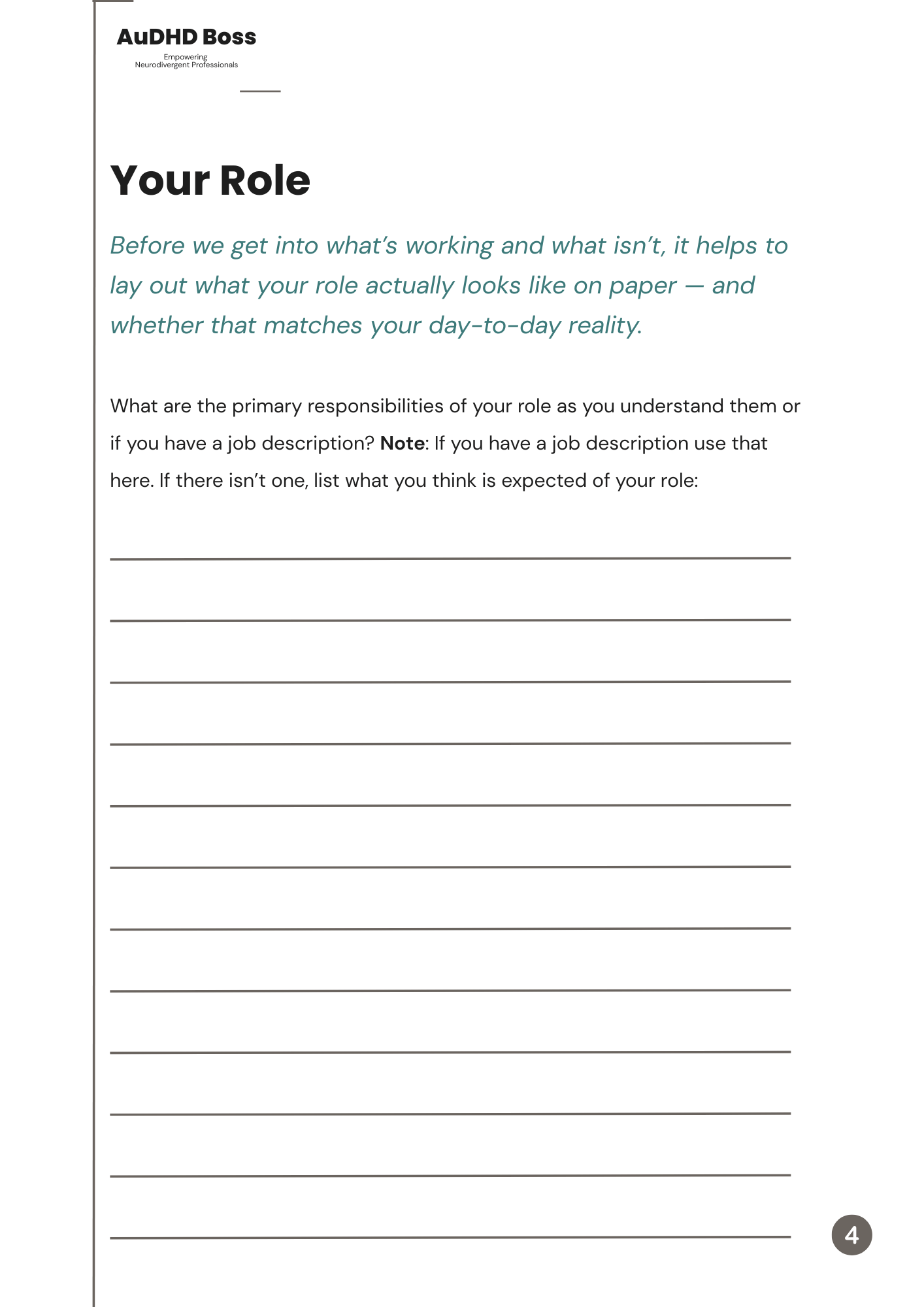 If you are late-diagnosed, high-masking, or navigating a corporate job with ADHD, autism, or AuDHD, this workbook gives you a structured way to name what is working, what is draining you, and what needs to change — before a performance review, a hard conversation with your manager, or a decision about whether to stay in your current role.