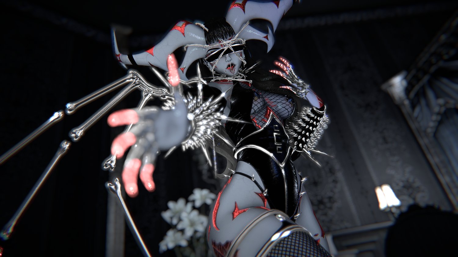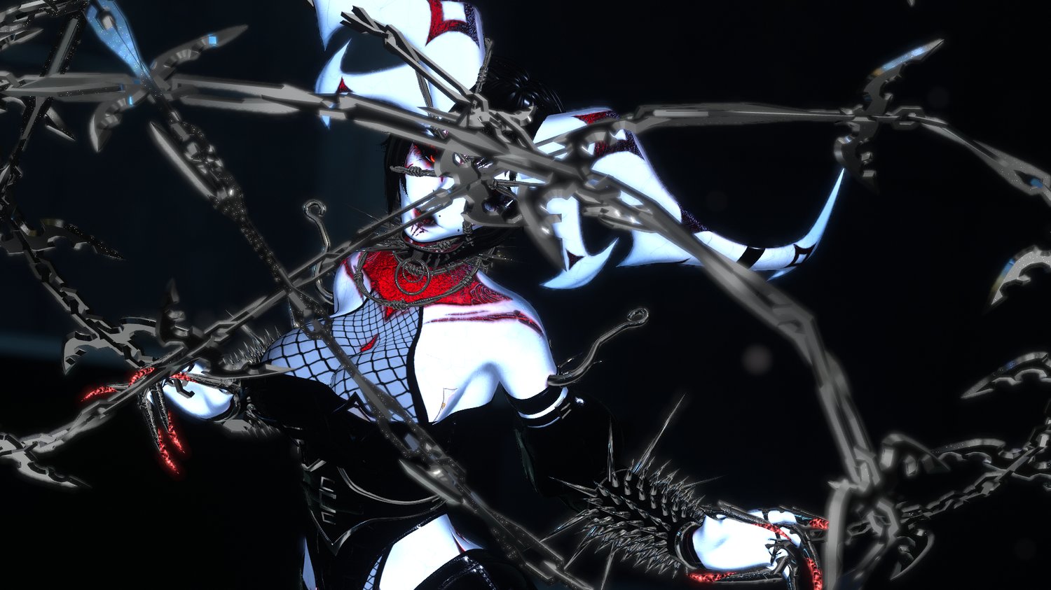 Socks and Garters, Horns, Wings, Corset Belt, Gauntlets, Skirt, Barbwire Heels, Spine, Fishnet Decal, Skin Textures, Arm Hooks, Arm Bands, Pole by Death Nuggies NOT FOR REUSE. All Non-Credited Textures are Handmade!
