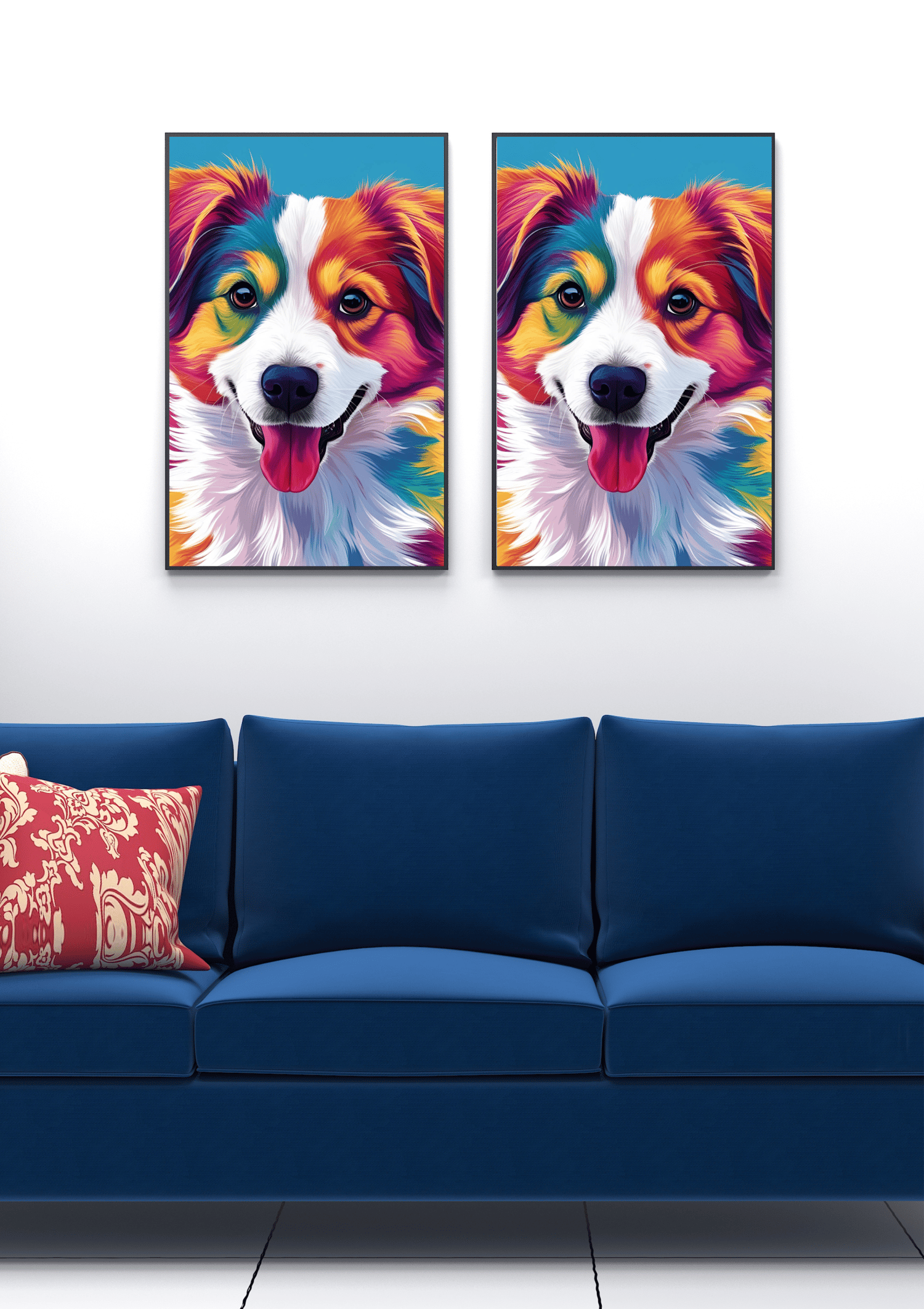 A vibrant image of a dog. It has an unusual pattern for a dog made clear by the blue and pink colors, suggesting a stylized rendition of a dog. The dog, judging by the shape and the form of its face resembles a Border Collie, also known for its great stamina and energy. Its joyful and infectious smile was further complemented by the vibrant colors. The plain blue background provides a great contrast to the subject making it stand out. Beyond the Breed, as it was titled, likely conveys a message about individuality beyond one’s class. This will be perfect on a setting involving diversity and animal welfare.