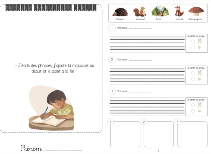 L'élève choisit une image, recopie correctement le mot, puis l'intègre dans une phrase. Il vérifie ensuite si la phrase contient bien la majuscule et le point.