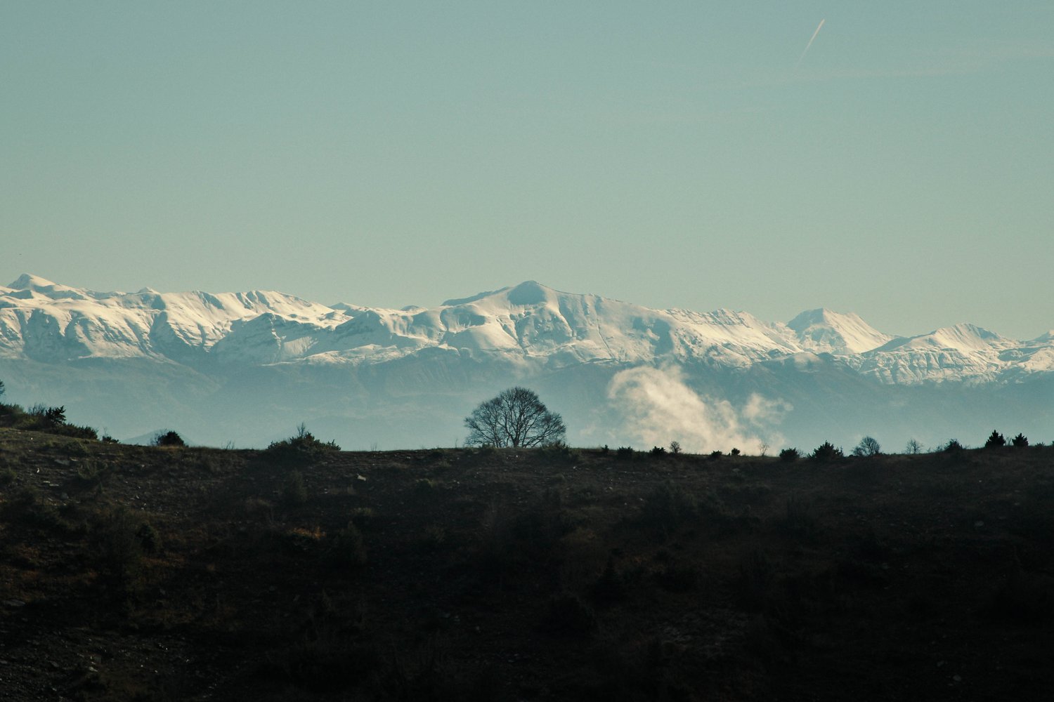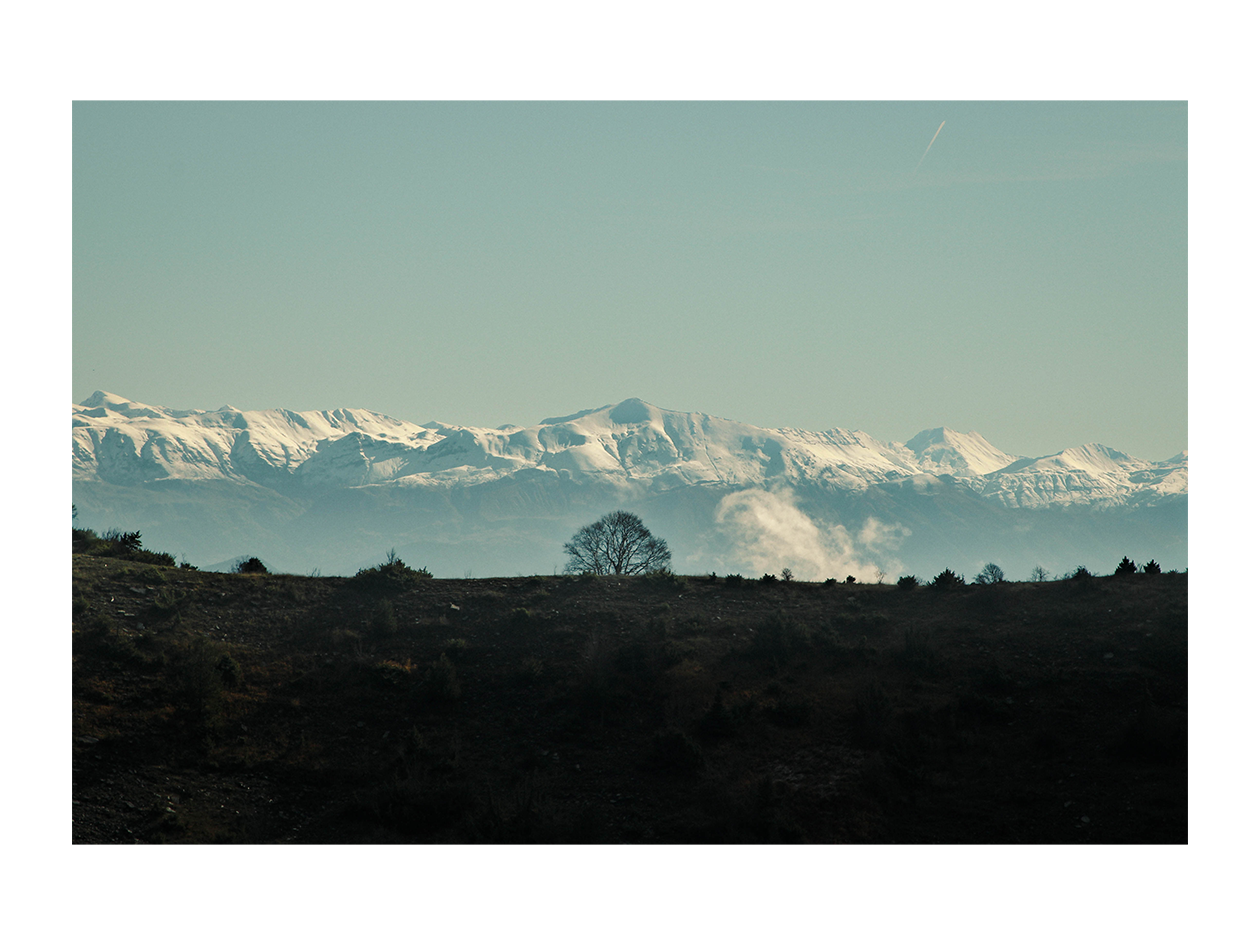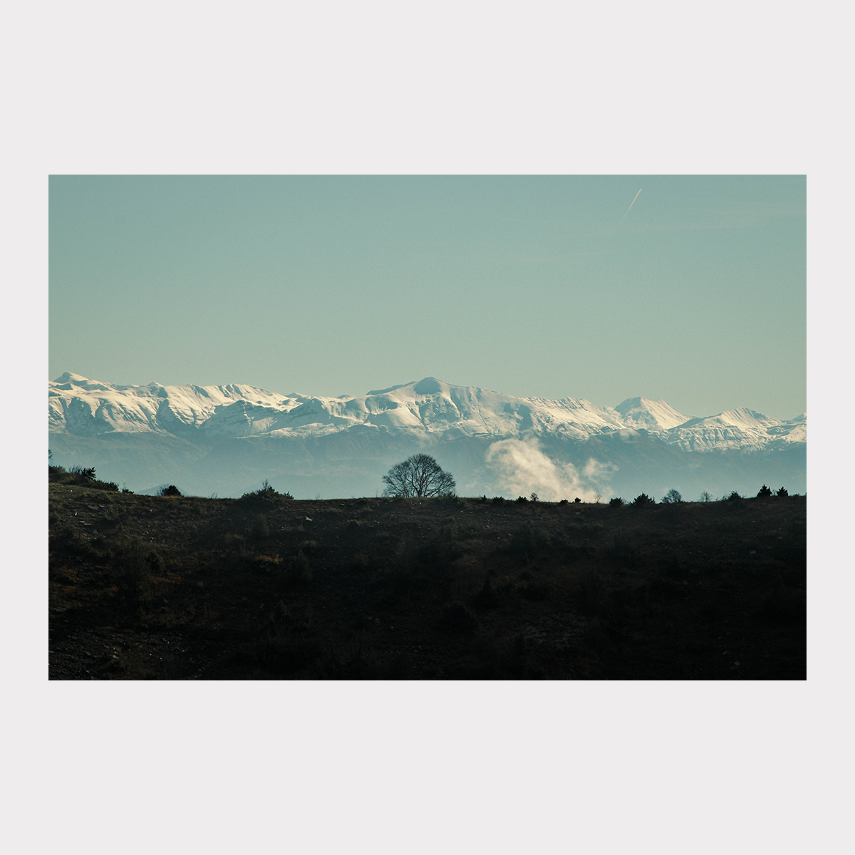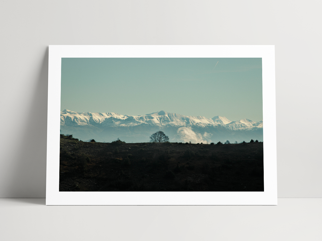 Au premier plan, une bande de terre sombre, presque noire, se détachait en contre-jour. Posé à son sommet, un arbre sans feuilles, typique de la saison hivernale, trônait seul, immobile. Derrière lui, une chaîne de montagnes se dessinait, à la fois discrète et imposante, teintée de bleu. Bien que proche de la couleur du ciel, elle s’en distinguait par son manteau neigeux, ses crêtes et ses ombres, révélant ses reliefs et sa profondeur.