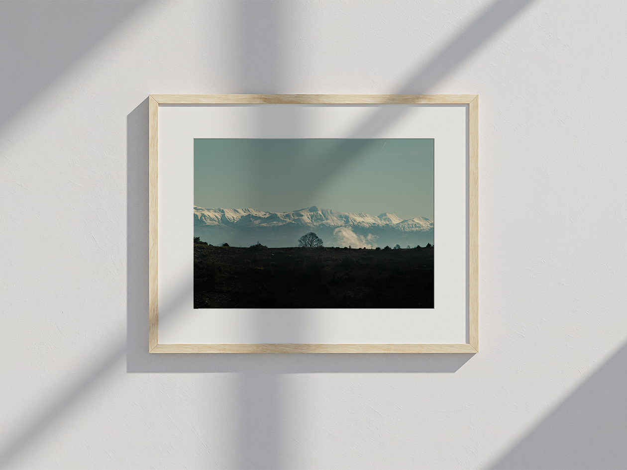 Cette photo a été prise dans les gorges de Vikos, au nord de la Grèce, lors d’une randonnée après plusieurs semaines de pluie. Ce jour-là, le ciel bleu avait enfin repris sa place. En me retournant, j’ai aperçu cette bande de terre sombre, surmontée d’un arbre sans feuilles, typique de l’hiver. Derrière lui se déployait une chaîne de montagnes bleutées, dont les crêtes enneigées se distinguaient du ciel dans un dialogue subtil. L’image se construit en trois strates — la terre, la montagne et le ciel — qui se superposent et s’équilibrent naturellement.