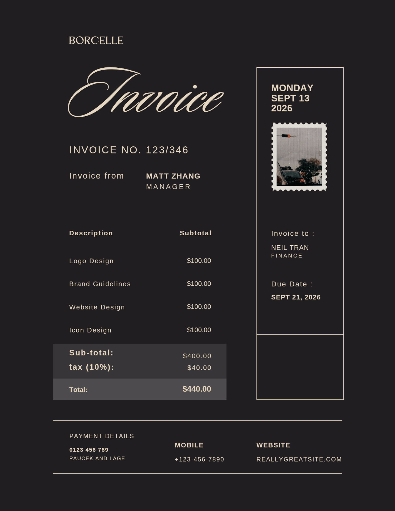 Impress clients and elevate your brand with the 'Dark Aesthetic Minimal Invoice Template'. This striking design is perfect for designers, freelancers, and small businesses seeking a sophisticated, high-end look that stands out from standard billing.