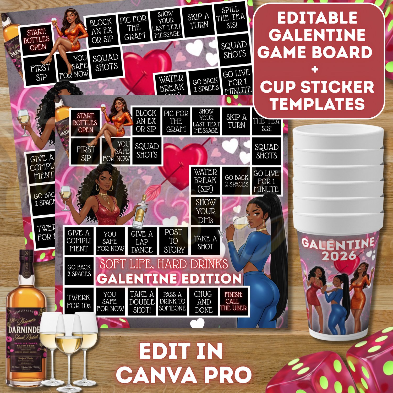 Host the ultimate Galentine’s party with this all-in-one digital drinking game set! Perfect for a girls' night in, this "Soft Life, Hard Drinks" game board and matching cup sticker templates are designed to keep the energy high and the drinks flowing. Featuring stunning illustrations and spicy challenges, it's the perfect way to celebrate your squad.