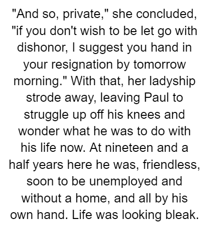 First Paragraph: "And so, private," she concluded, "if you don't wish to be let go with dishonor, I suggest you hand in your resignation by tomorrow morning." With that, her ladyship strode away, leaving Paul to struggle up off his knees and wonder what he was to do with his life now. At nineteen and a half years here he was, friendless, soon to be unemployed and without a home, and all by his own hand. Life was looking bleak.