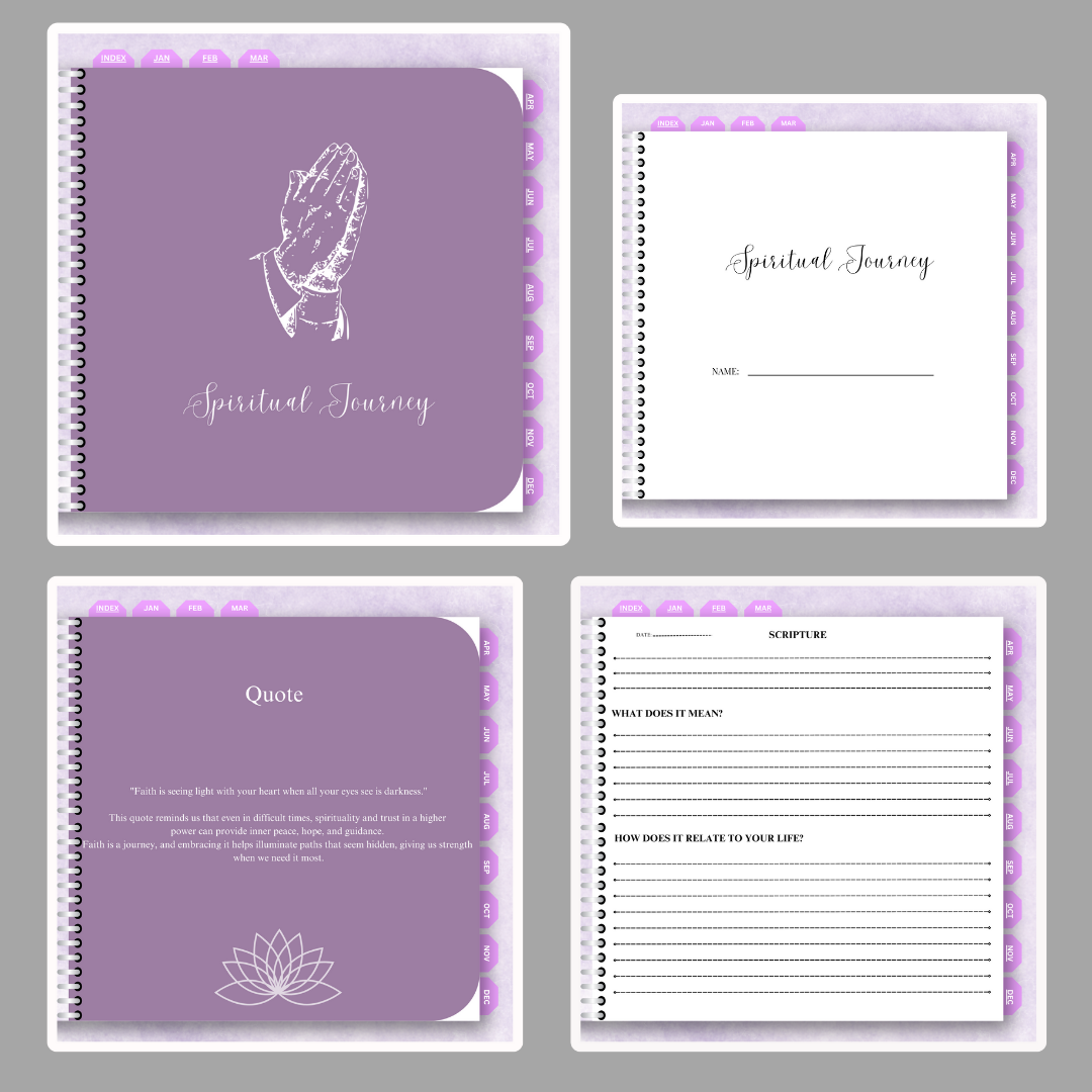 A spiritual journal is a dedicated space for reflecting on your faith journey, exploring personal beliefs, and connecting more deeply with your inner self. Designed to guide you through each month, it serves as both a sanctuary for your thoughts and a roadmap for spiritual growth. Within its pages, you'll find prompts to inspire reflection on gratitude, love, patience, forgiveness, and hope, all aimed at fostering peace, clarity, and inner strength.