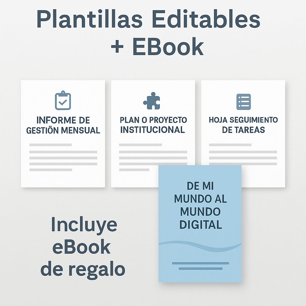 Combo de Gestión Institucional – 3 Plantillas Editables + eBook “De Mi Mundo al Mundo Digital”