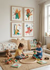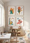 - This set of 4 posters features lovable animals - a rocking lion, a saxophone-playing giraffe, a violin-playing squirrel, and a singing owl - designed in a soft, modern Scandinavian style. With their warm colors and clean lines, these prints add a touch of whimsy and inspiration to any nursery or playroom.
