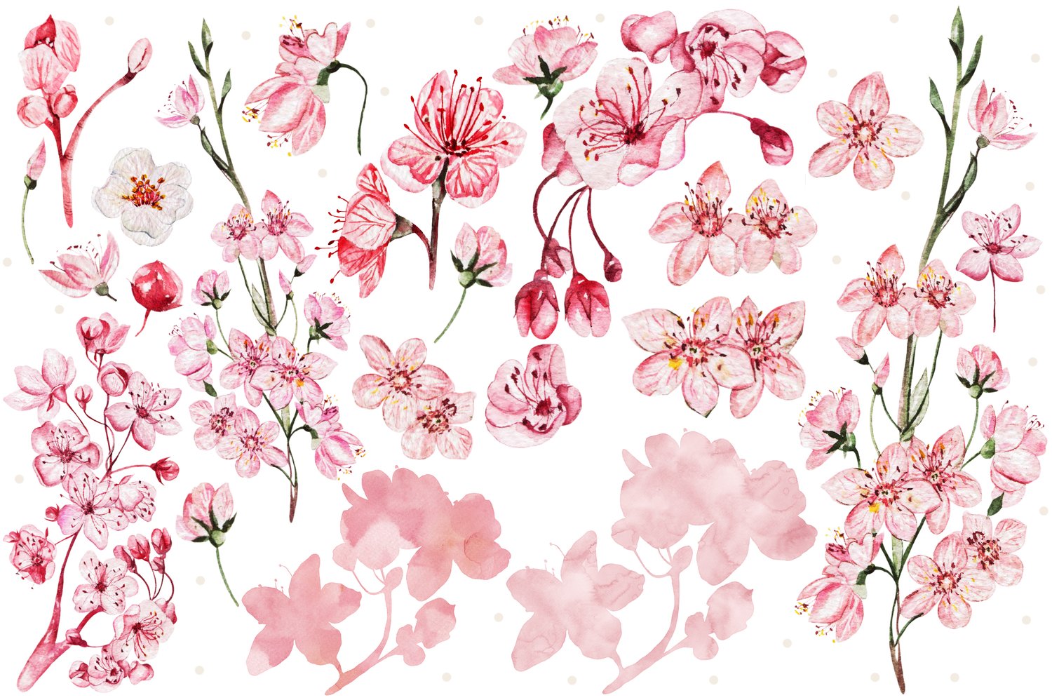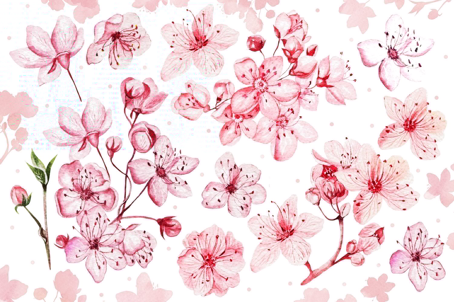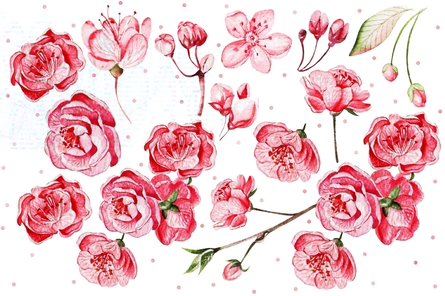 This watercolor set consists of 66 watercolor elements. They include patterns, wreaths and elements separately. Delicate watercolor Cherry blossom flower and leaves.