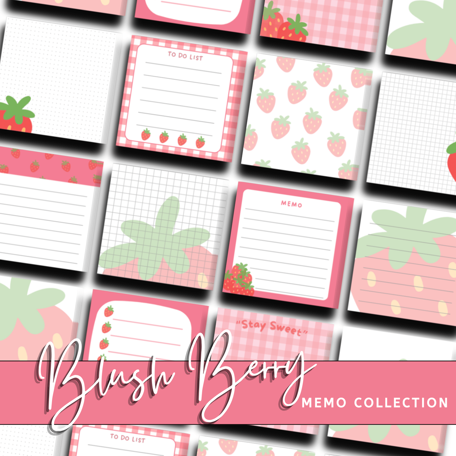 🍓🍃 The Blush Berry Memo Collection brings you a charming bundle of 12 printable 3x3" memo pads featuring juicy strawberries, pastel pinks, gingham patterns, and playful fruit-themed designs