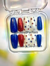 Ready to sparkle with patriotic flair? ✨ These gorgeous, hand-painted press-on nails are made with high-quality Gel-X, ensuring they're both strong and reusable. The red, white, and blue design with glitter and embellishments is perfect for any patriotic occasion.