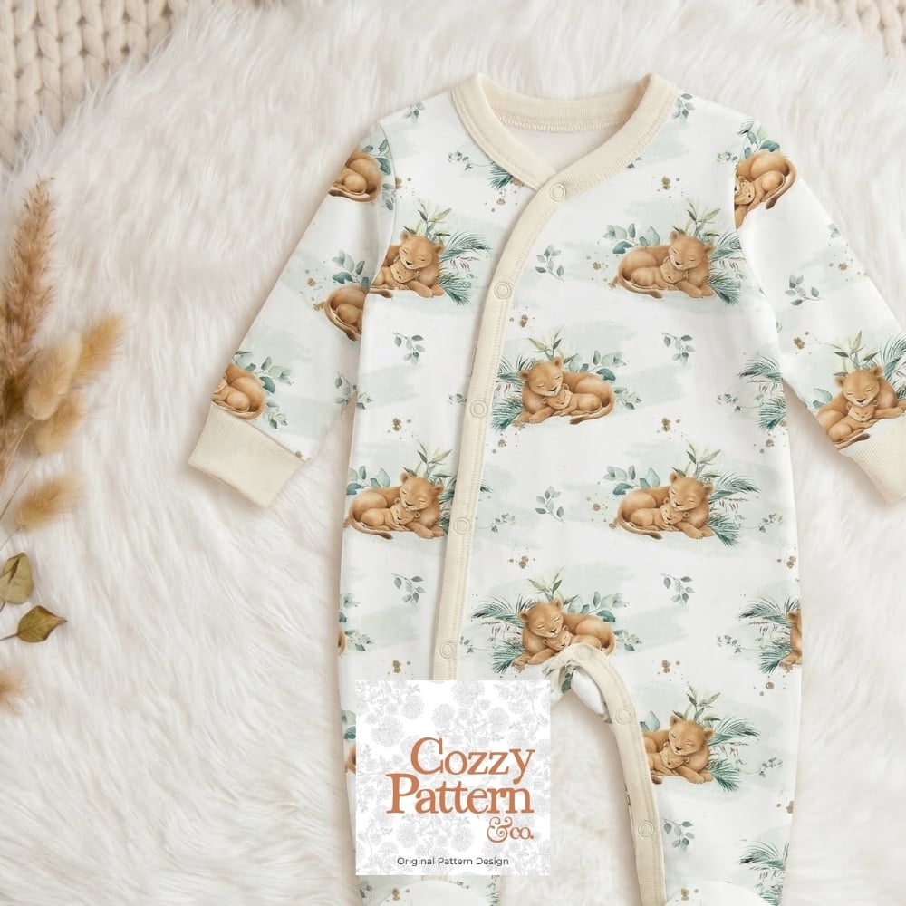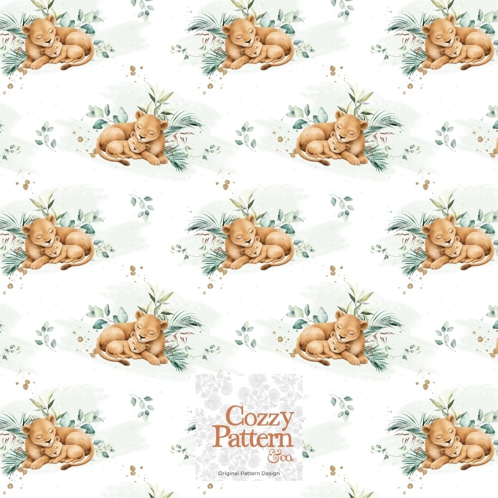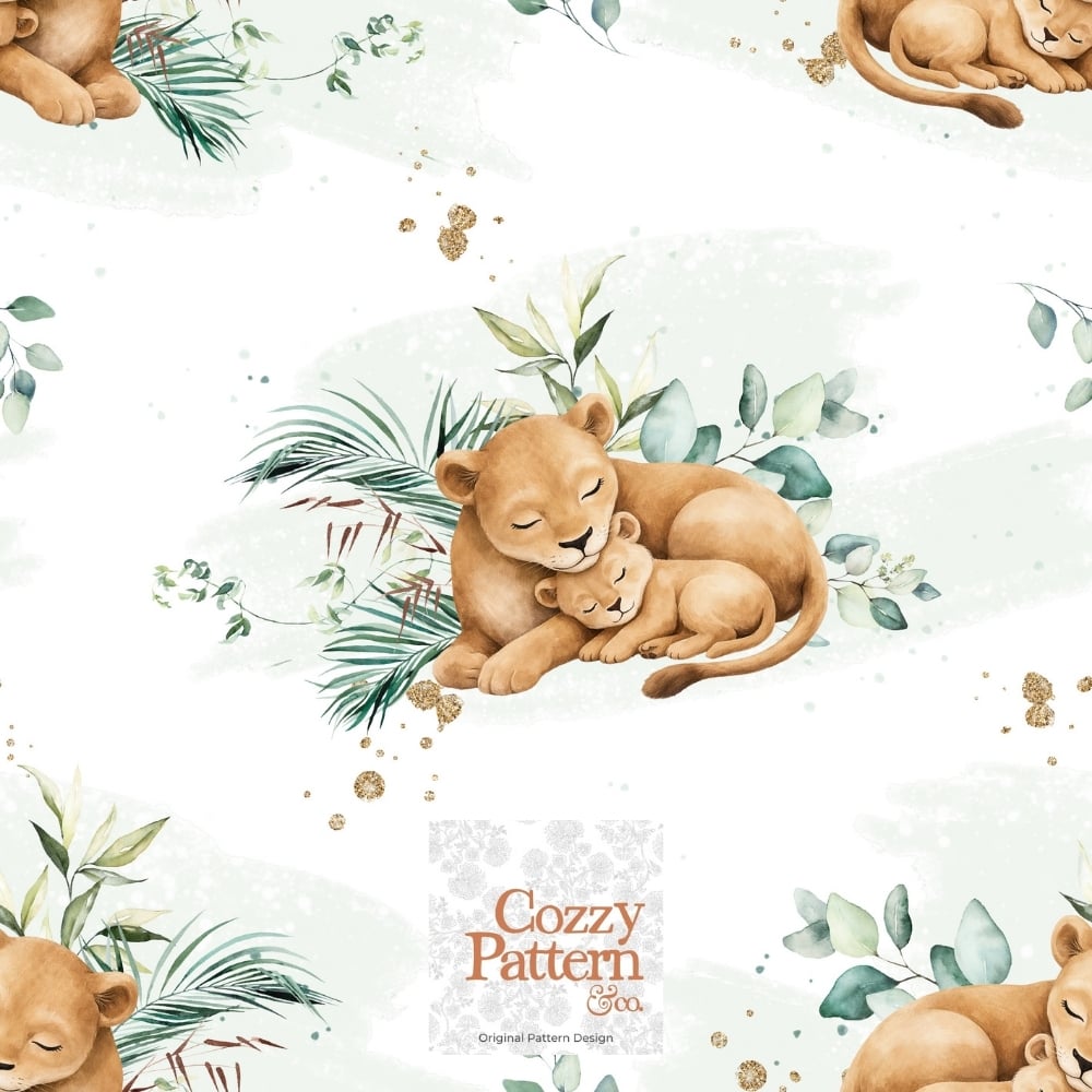 Create adorable baby and nursery projects with this sleeping lion cub seamless pattern, a soft safari-inspired design featuring a mother lion cuddling her baby surrounded by delicate leaves, butterflies and subtle botanical elements.